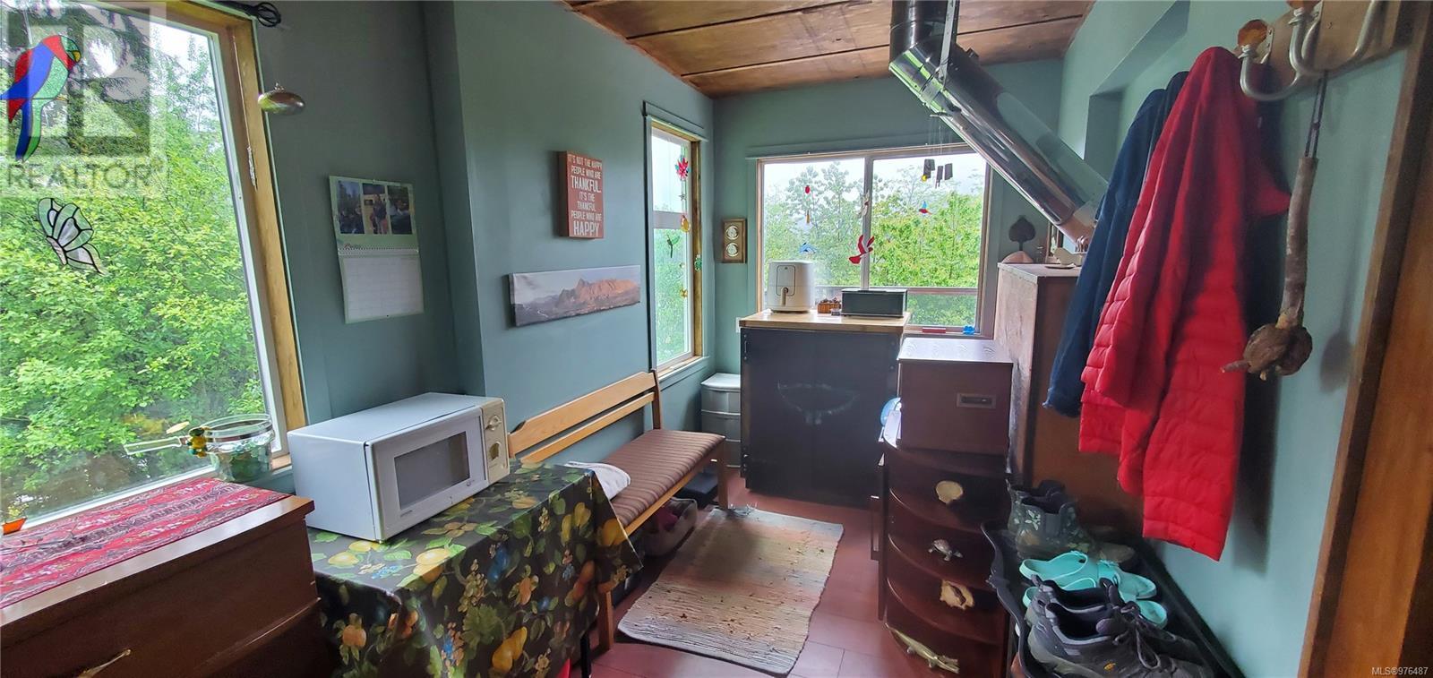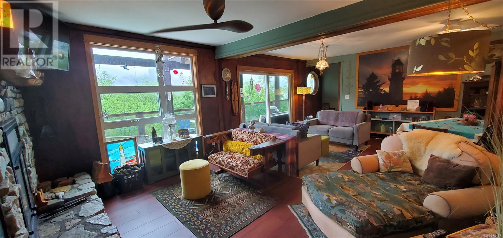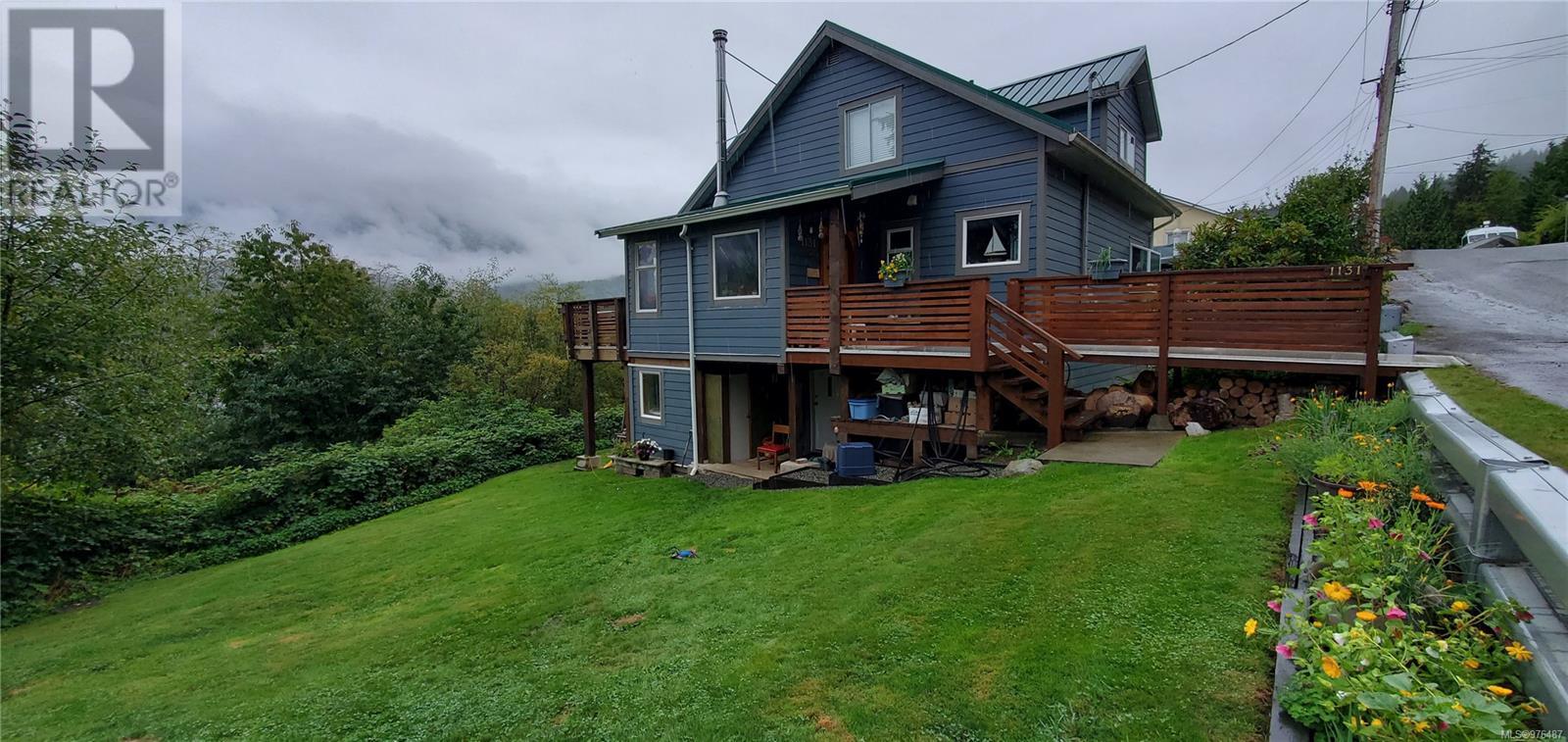 Charming three story nautical themed property in beautiful Tahsis. An outdoor kitchen for the summer months and power outages, three decks to enjoy the views of the mountains and ocean! Main floor has large covered entrance with hand made front door, ships bell and porthole, dining/living combo with custom local stone certified wood burning fireplace. There is an office nook with lighthouse glass feature, main bath with glass and tiled shower, rain head & hand held shower head and painted sink in vanity. Spacious laundry room with sink & counter for folding, storage and a large window. Open kitchen with garden window, custom pot and cup rack, double oven stove, large island cabinet with butcher block top and large pantry. Great vinyl deck off this floor also has covered area and ramp to upper parking. Upstairs has a large bathroom with deep tub, painted sink and lots of storage, primary bedroom has large circular window and vinyl deck to enjoy the beautiful views. Second bedroom is a good size and cozy. Lower floor has ground level walk out and is mainly unfinished, good large space to make a workshop or suite. There is also a lower bath with corner shower, deck, laundry sink, and third bedroom. Enjoy this home as a getaway or live the west coast dream! (id:48970)