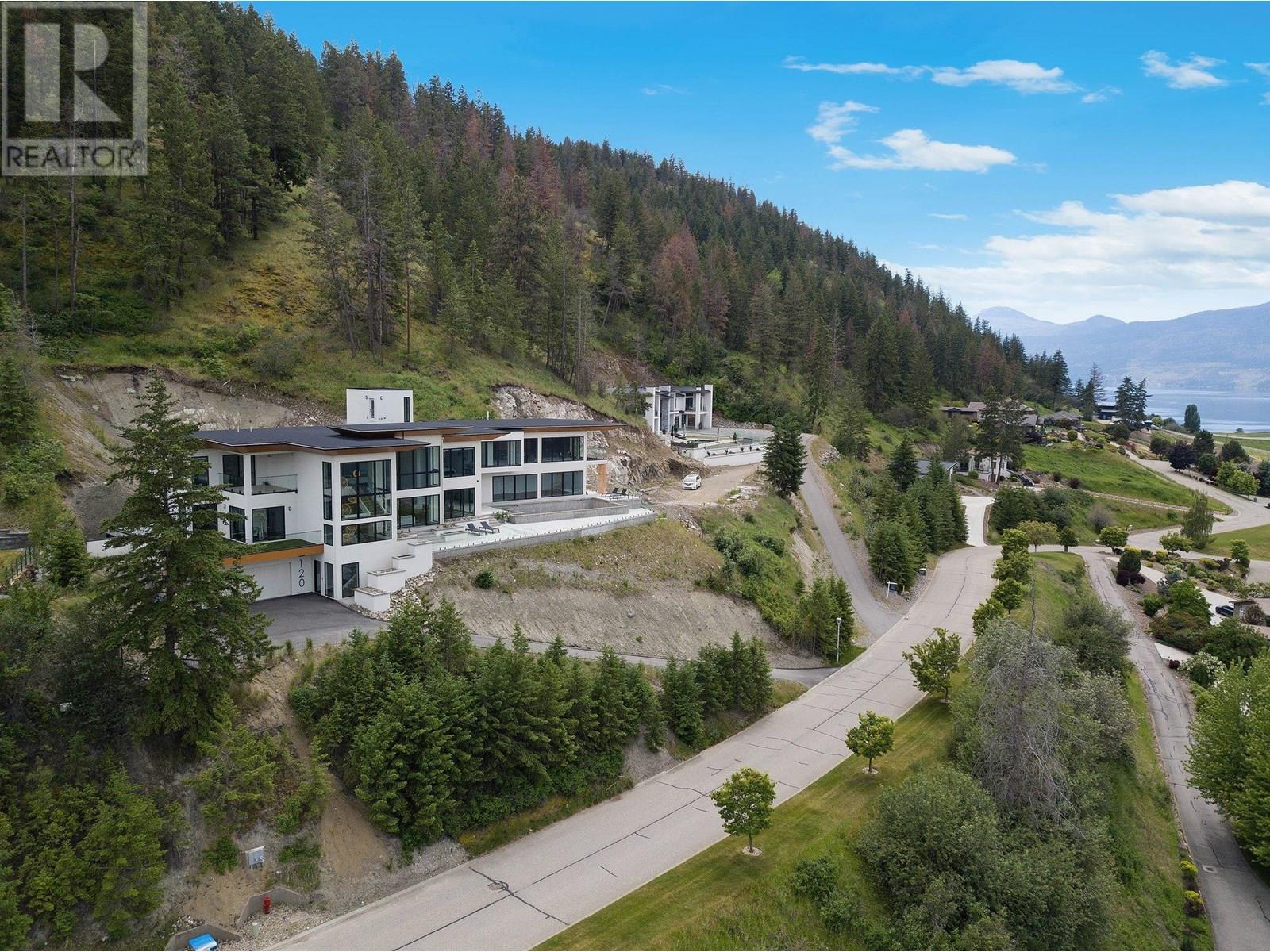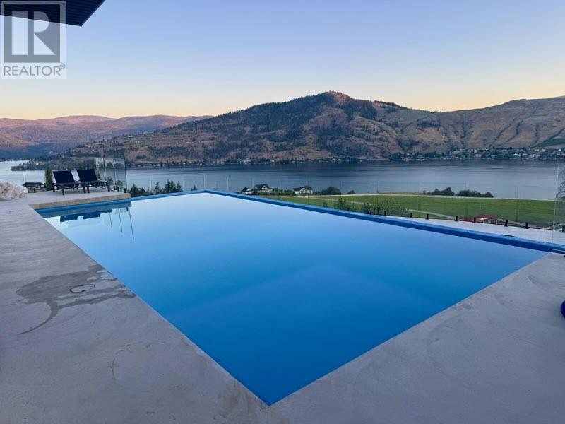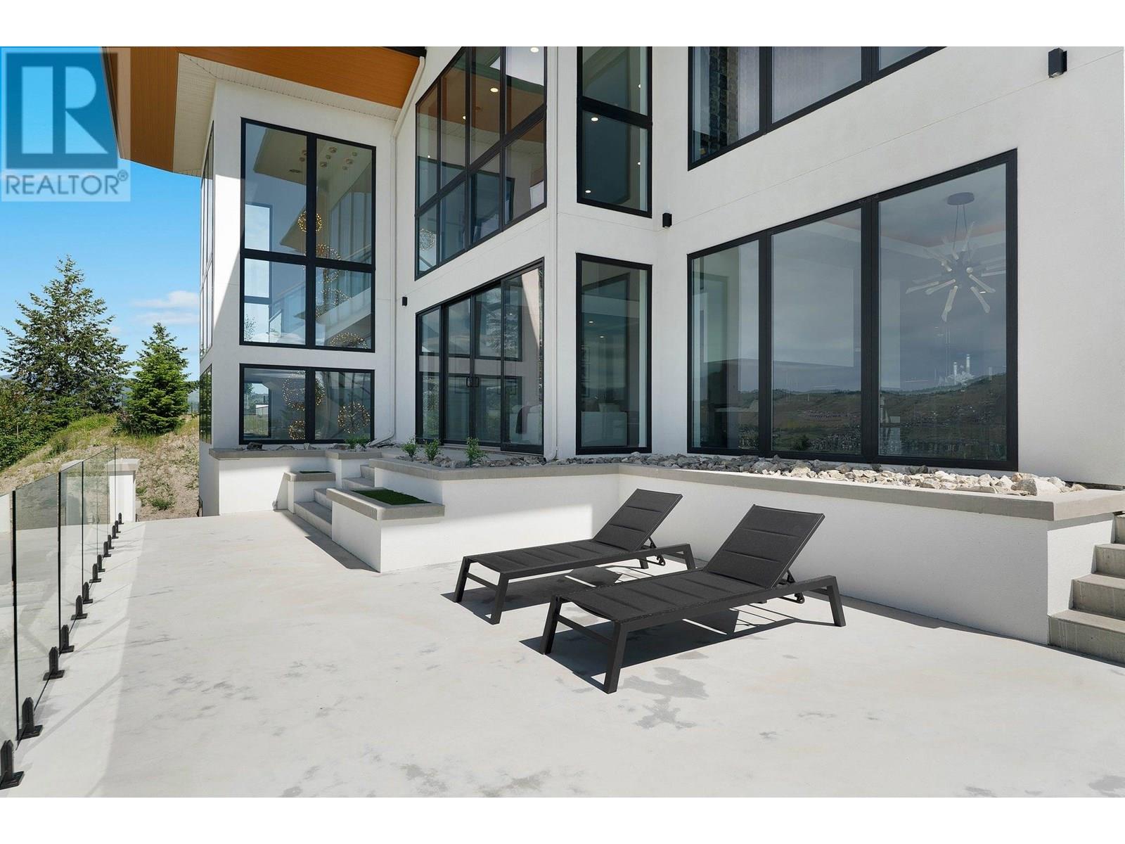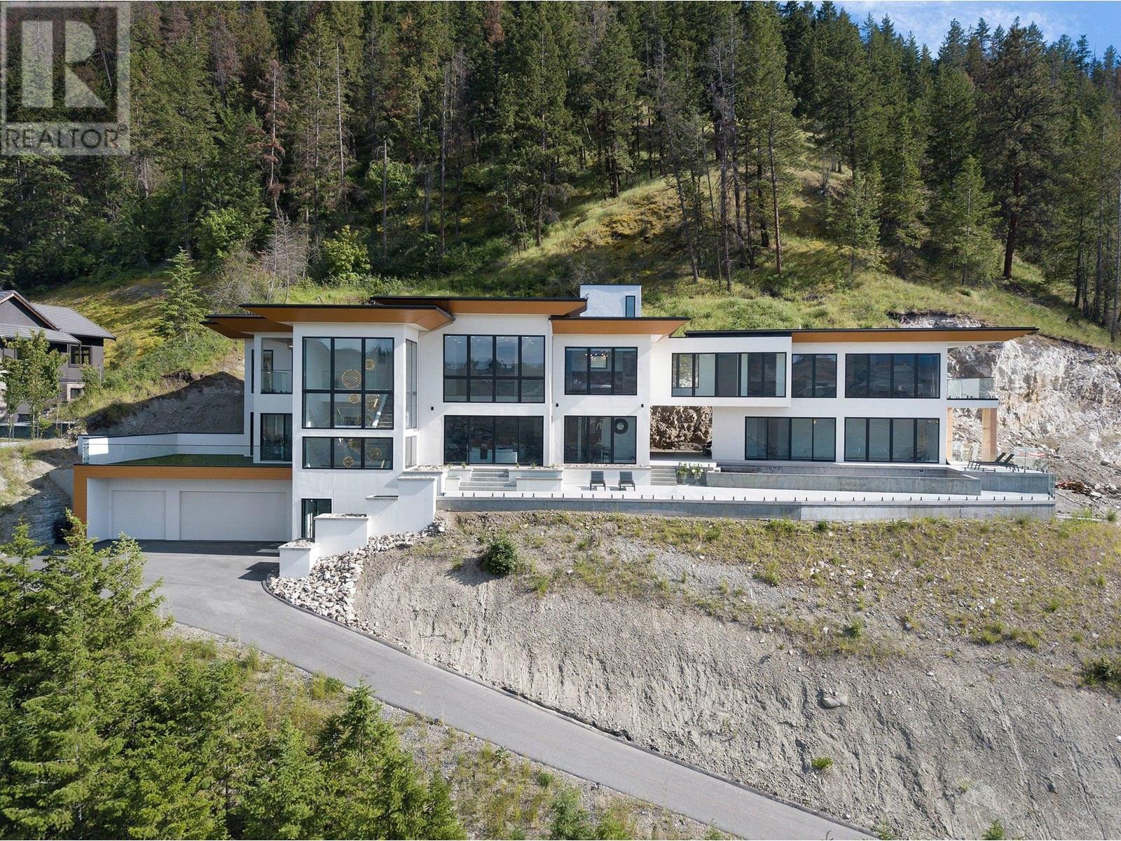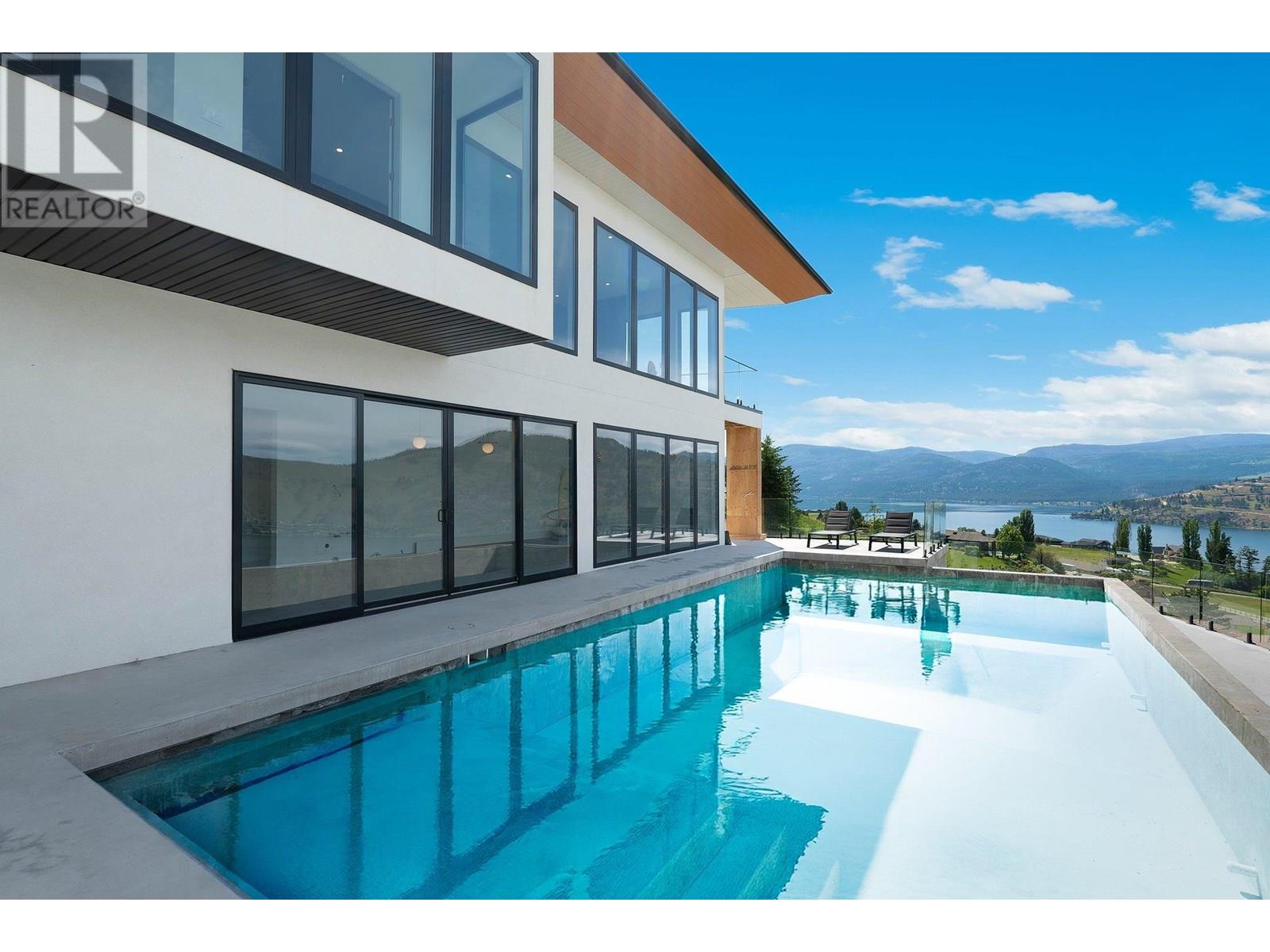 Welcome to Beverly Hills Estates! This modern luxury home sits on over 1 acre & spans over 9000 sq ft. The thoughtful design includes uninterrupted views of Okanagan lake & paradise ranch. The 3 car garage opens into a large mudroom. The Versace Elevator will take you up to the kitchen or bedrooms. If you take the stairs, you will see an incredible 3 story chandelier that cascades 20 ft! The kitchen features a 16 ft waterfall island with leathered granite, a 48” 8 burner range, 2 dishwashers, gorgeous hardware & built-ins. The pantry & wet bar offer ample storage, combi oven, fridge/freezer & ice makers. The great room features 22 ft ceilings with floor to ceiling windows & an 84” ethanol fireplace that connects to the dining room. A glass hall leads to the primary wing with sitting area, full bar, spa bath & dressing room with laundry. There is a second primary bedroom & 3 additional bedrooms, all with ensuites. All 5 bedrooms are on one level with a double laundry, open concept office & cigar lounge. The main floor offers a gym, theatre room and flex space. The designated pool house with in/out bath opens into the outdoor kitchen & offers a salt sauna & yoga/massage room. Heated floors, high end mechanical systems & desirable location make this home worth viewing! Located near the Vernon airport and on the perimeter of the SenseNet system installed by Predator Ridge. Fire response to this area has been trialed and is leading in forest fire response technology. (id:48970)