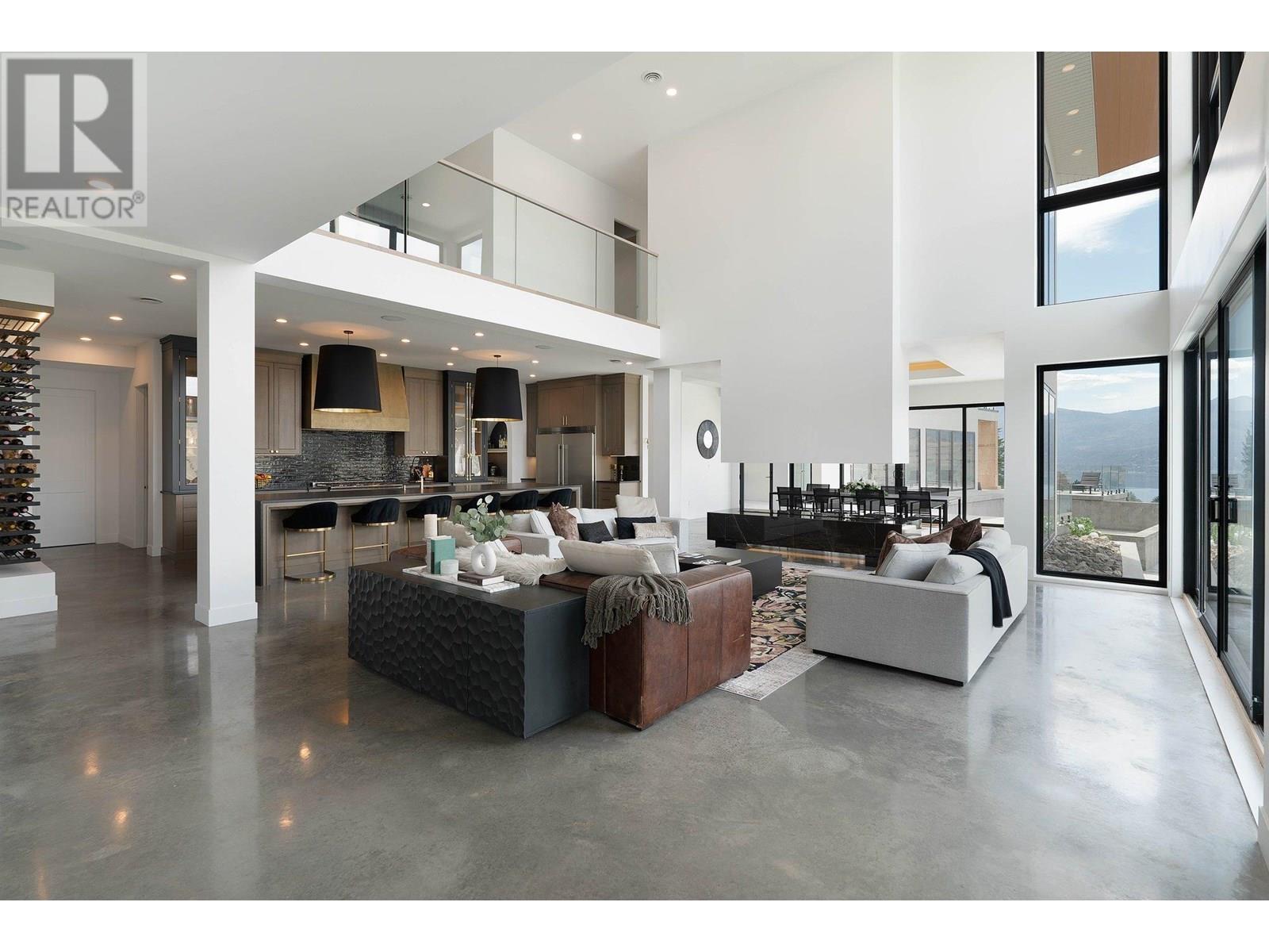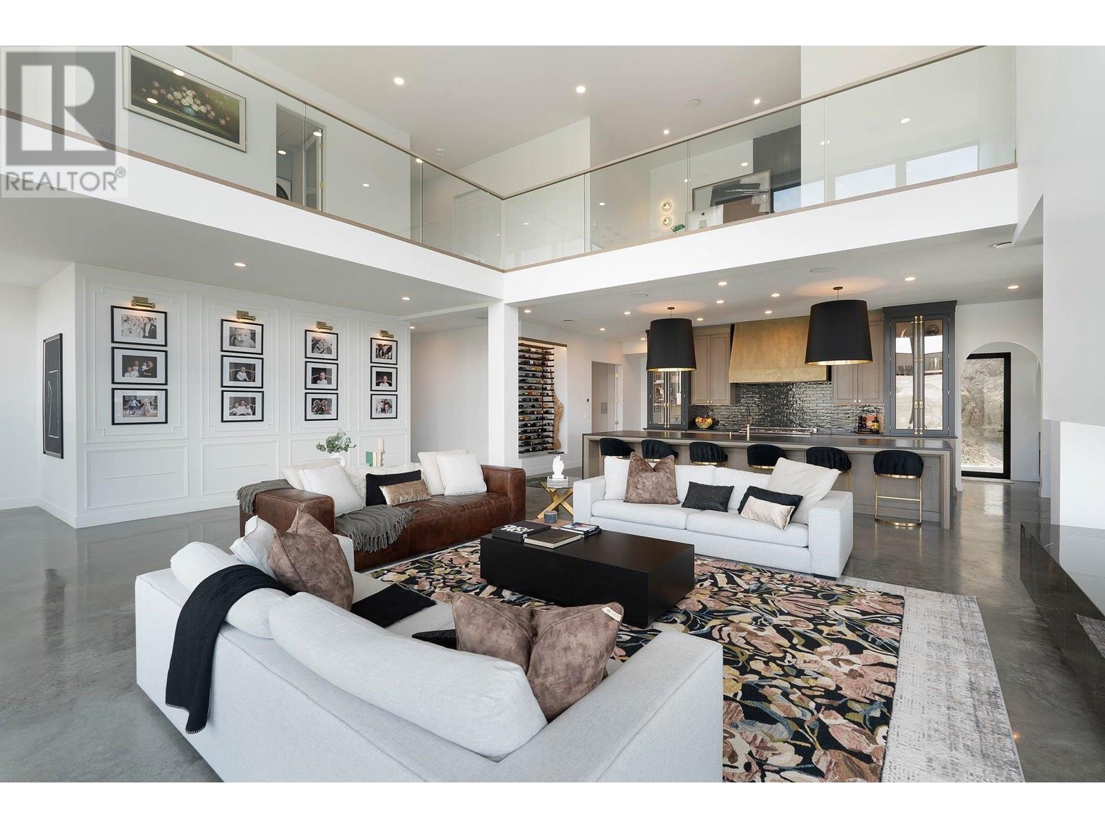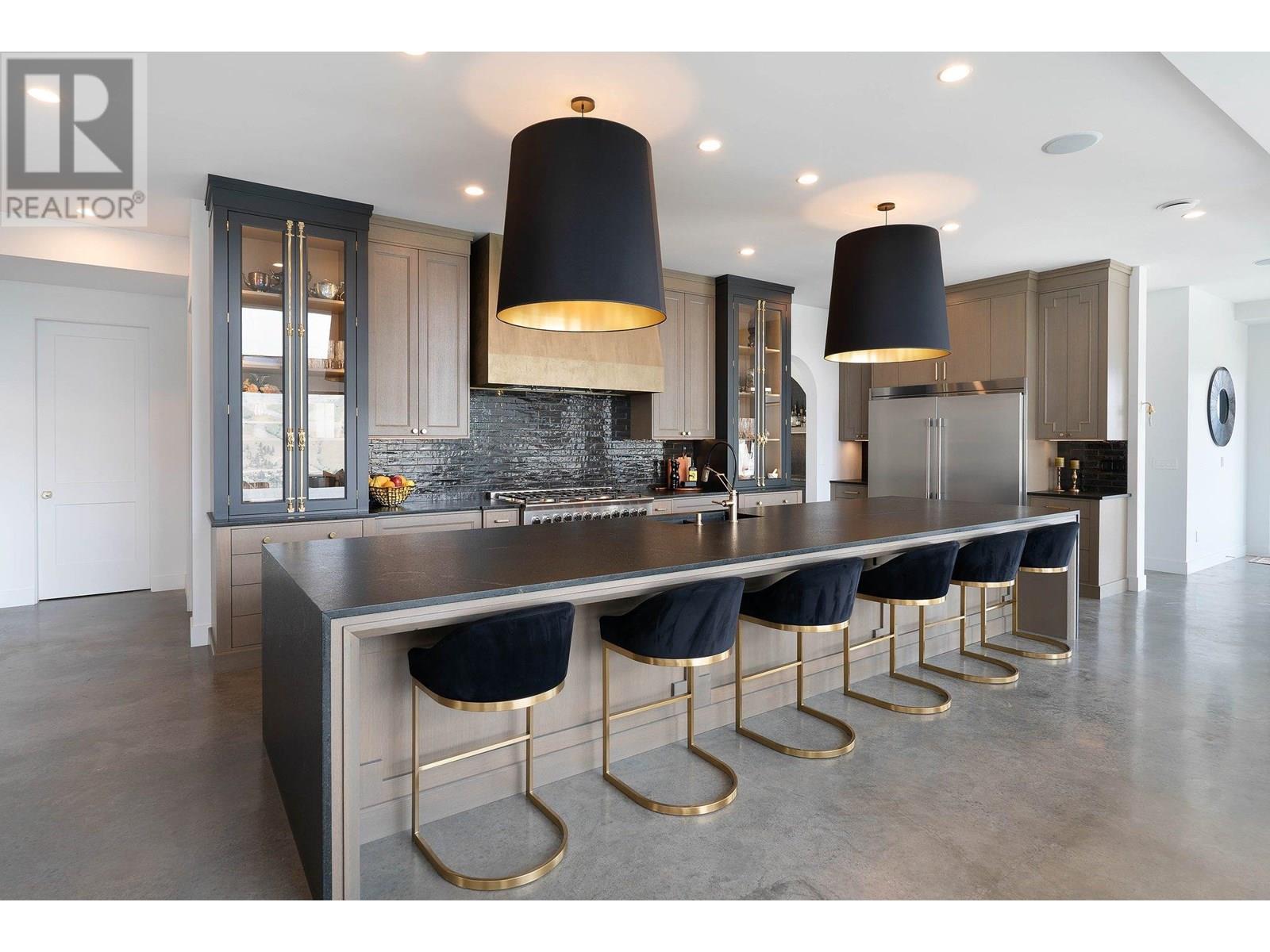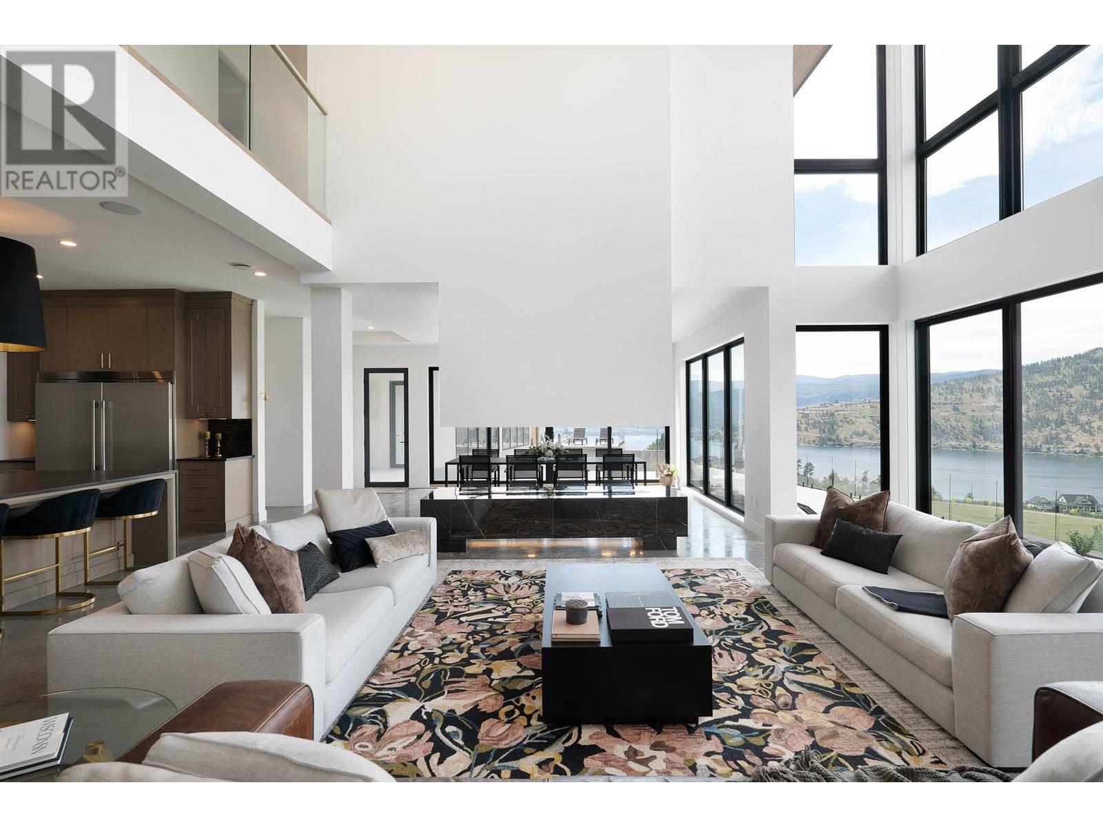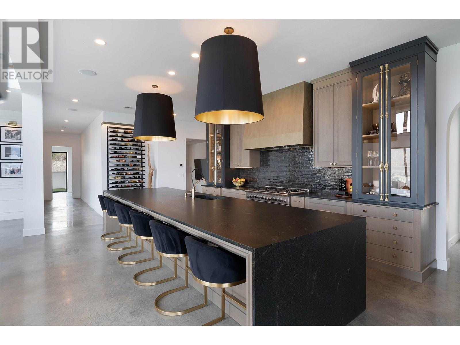 Welcome to Beverly Hills Estates! This modern luxury home sits on over 1 acre & spans over 9000 sq ft. The thoughtful design includes uninterrupted views of Okanagan lake & paradise ranch. The 3 car garage opens into a large mudroom. The Versace Elevator will take you up to the kitchen or bedrooms. If you take the stairs, you will see an incredible 3 story chandelier that cascades 20 ft! The kitchen features a 16 ft waterfall island with leathered granite, a 48” 8 burner range, 2 dishwashers, gorgeous hardware & built-ins. The pantry & wet bar offer ample storage, combi oven, fridge/freezer & ice makers. The great room features 22 ft ceilings with floor to ceiling windows & an 84” ethanol fireplace that connects to the dining room. A glass hall leads to the primary wing with sitting area, full bar, spa bath & dressing room with laundry. There is a second primary bedroom & 3 additional bedrooms, all with ensuites. All 5 bedrooms are on one level with a double laundry, open concept office & cigar lounge. The main floor offers a gym, theatre room and flex space. The designated pool house with in/out bath opens into the outdoor kitchen & offers a salt sauna & yoga/massage room. Heated floors, high end mechanical systems & desirable location make this home worth viewing! Located near the Vernon airport and on the perimeter of the SenseNet system installed by Predator Ridge. Fire response to this area has been trialed and is leading in forest fire response technology. (id:48970)