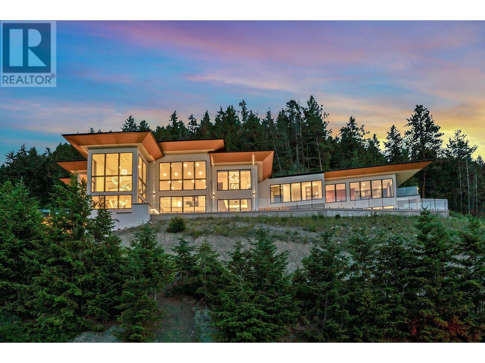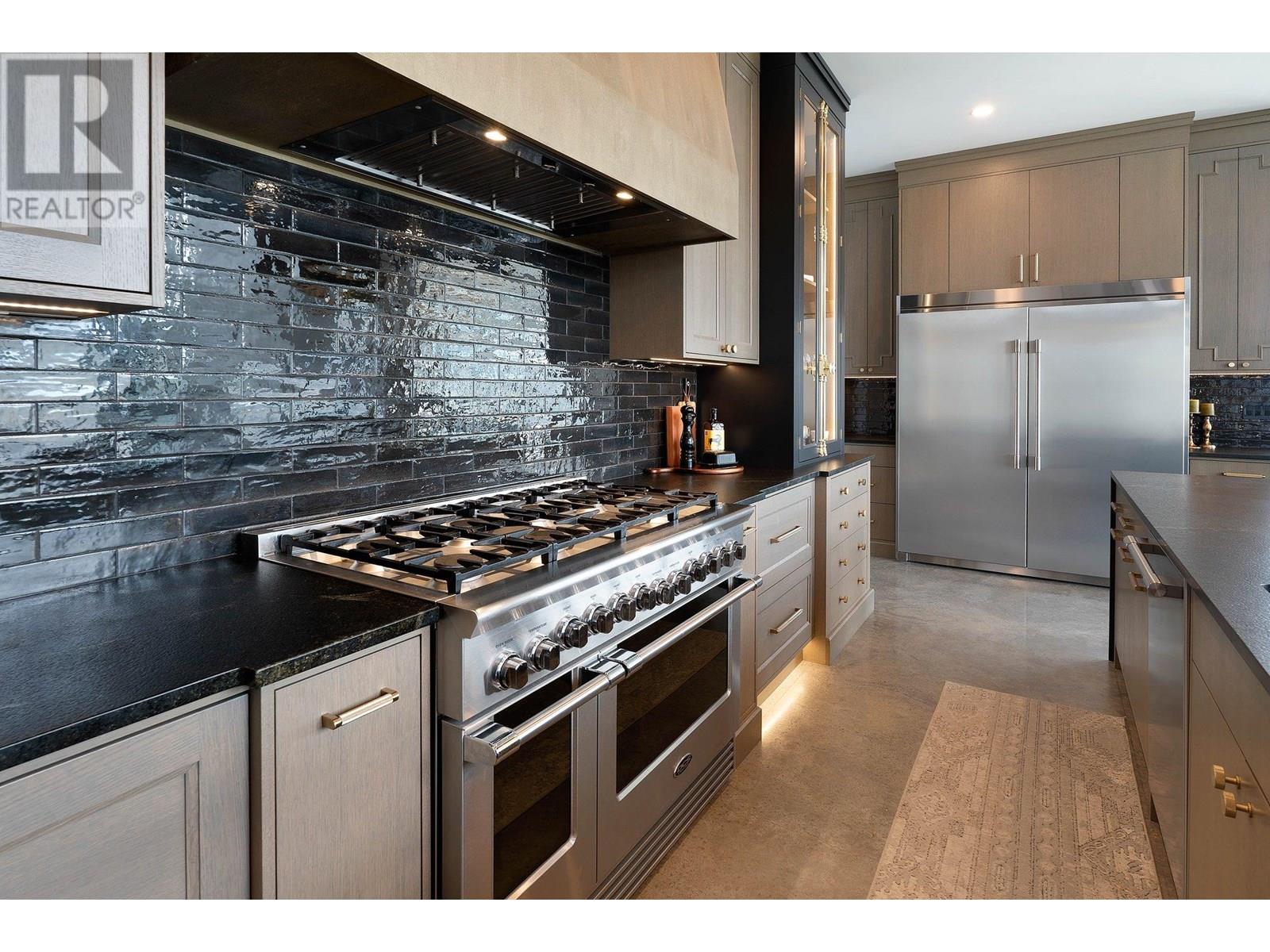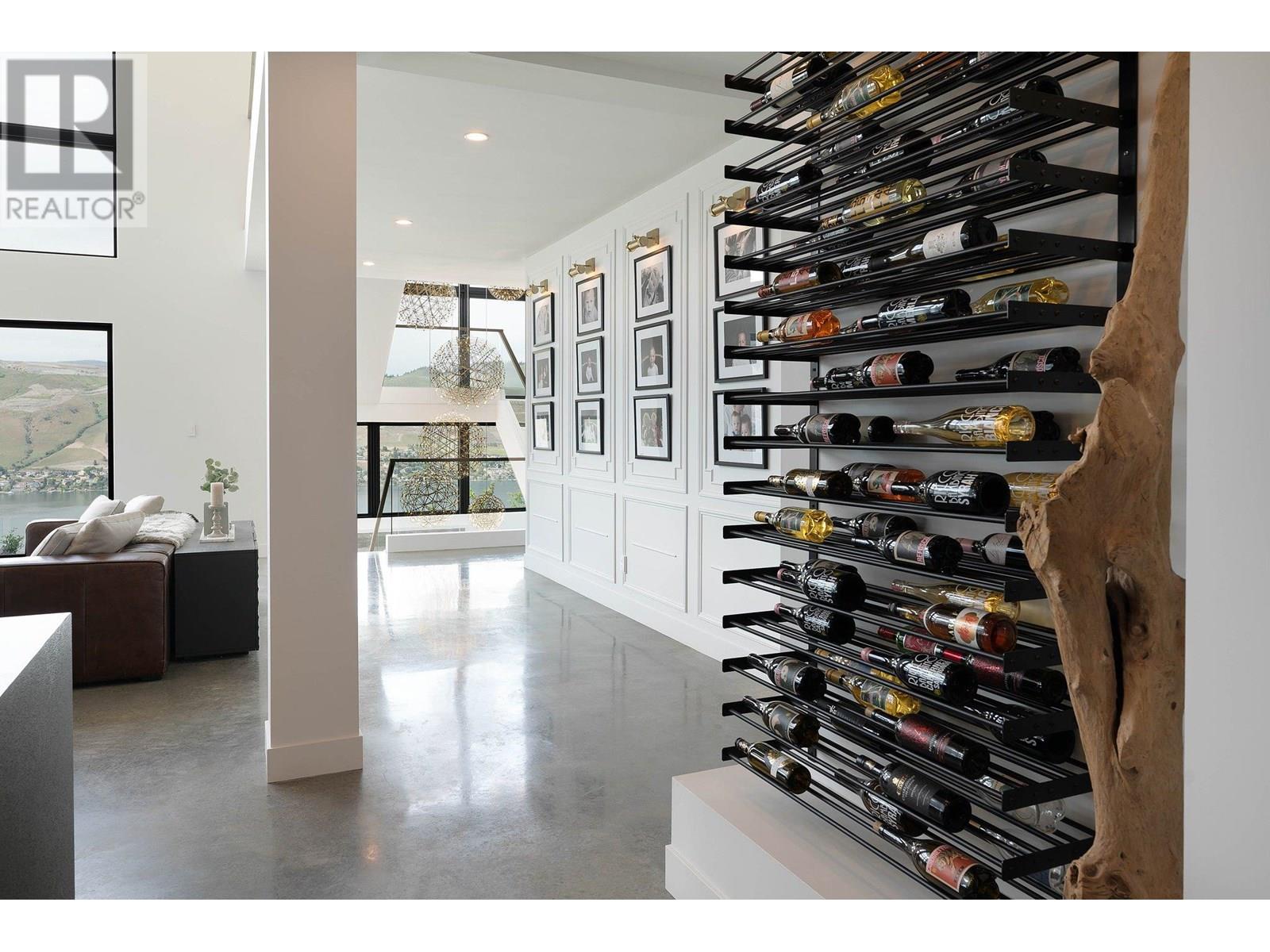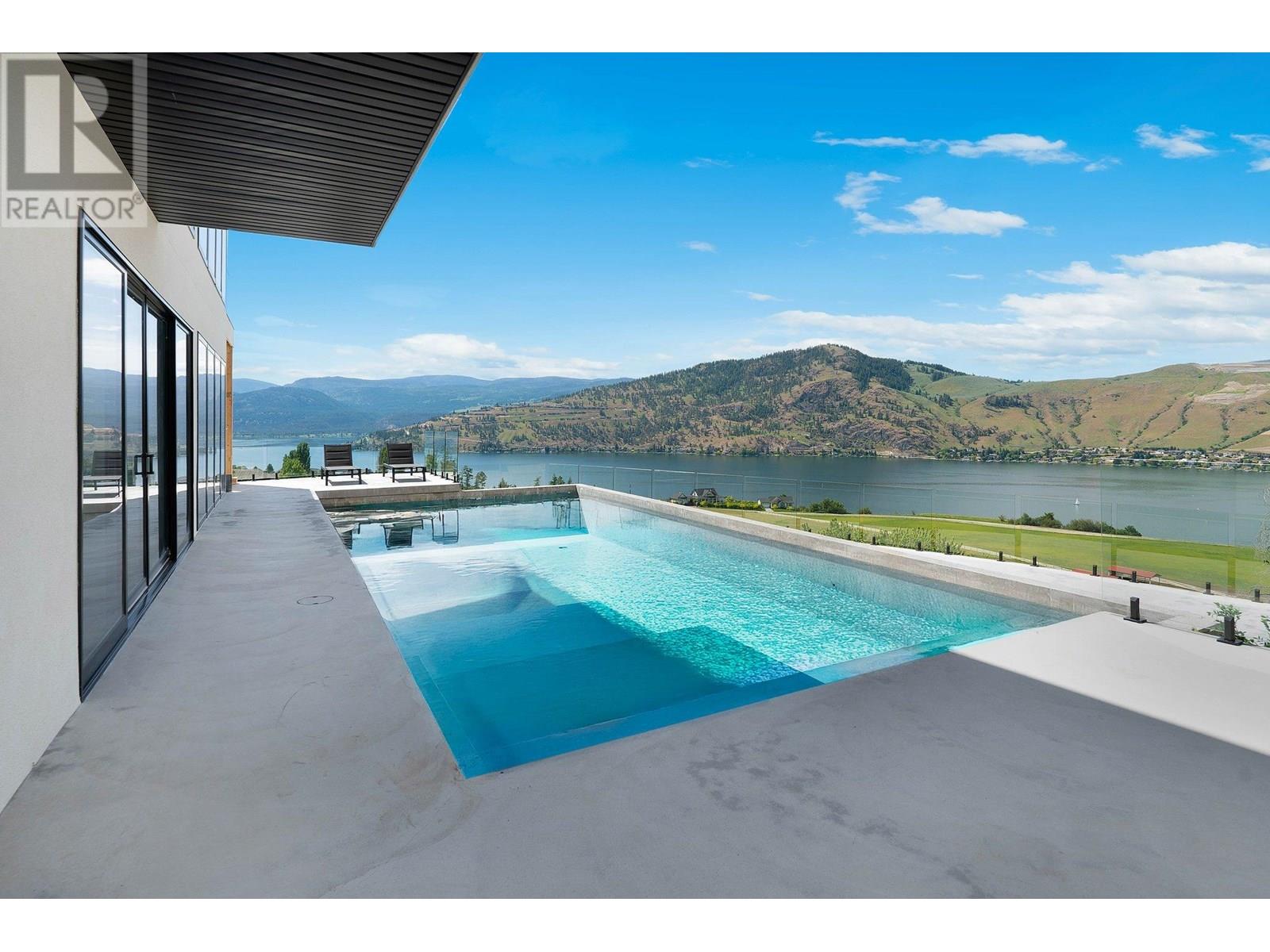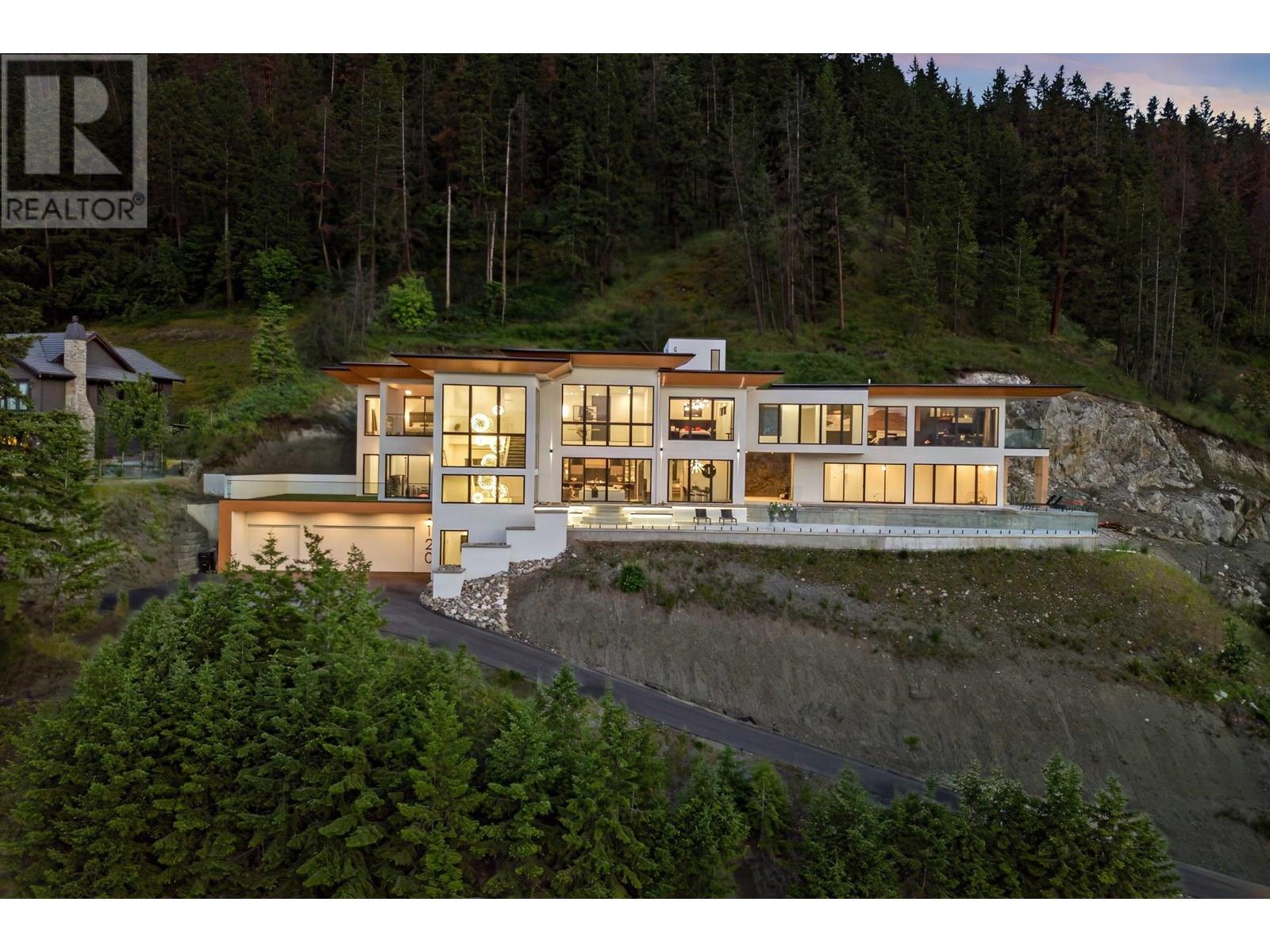 Welcome to Beverly Hills Estates! This modern luxury home sits on over 1 acre & spans over 9000 sq ft. The thoughtful design includes uninterrupted views of Okanagan lake & paradise ranch. The 3 car garage opens into a large mudroom. The Versace Elevator will take you up to the kitchen or bedrooms. If you take the stairs, you will see an incredible 3 story chandelier that cascades 20 ft! The kitchen features a 16 ft waterfall island with leathered granite, a 48” 8 burner range, 2 dishwashers, gorgeous hardware & built-ins. The pantry & wet bar offer ample storage, combi oven, fridge/freezer & ice makers. The great room features 22 ft ceilings with floor to ceiling windows & an 84” ethanol fireplace that connects to the dining room. A glass hall leads to the primary wing with sitting area, full bar, spa bath & dressing room with laundry. There is a second primary bedroom & 3 additional bedrooms, all with ensuites. All 5 bedrooms are on one level with a double laundry, open concept office & cigar lounge. The main floor offers a gym, theatre room and flex space. The designated pool house with in/out bath opens into the outdoor kitchen & offers a salt sauna & yoga/massage room. Heated floors, high end mechanical systems & desirable location make this home worth viewing! Located near the Vernon airport and on the perimeter of the SenseNet system installed by Predator Ridge. Fire response to this area has been trialed and is leading in forest fire response technology. (id:48970)
