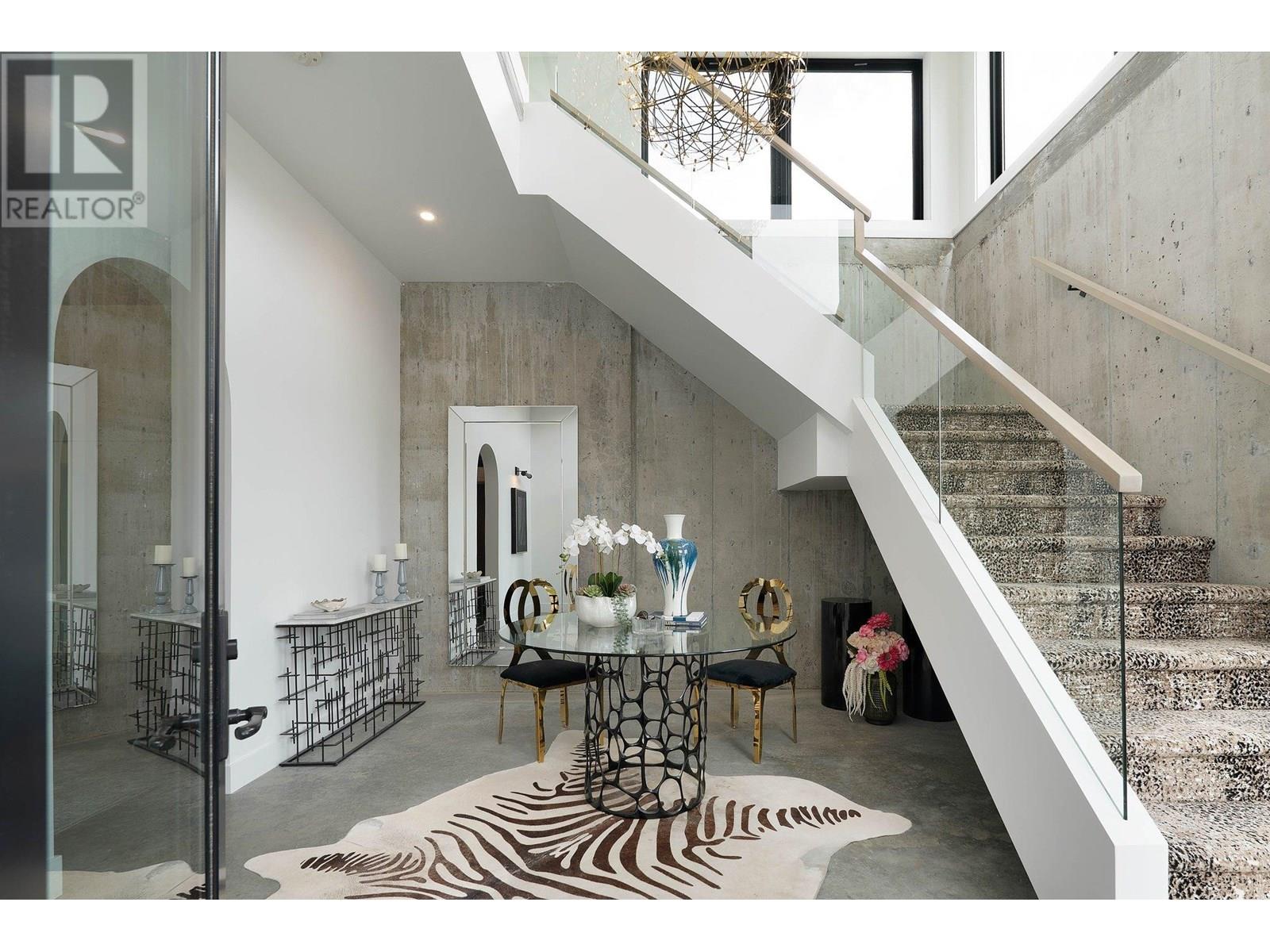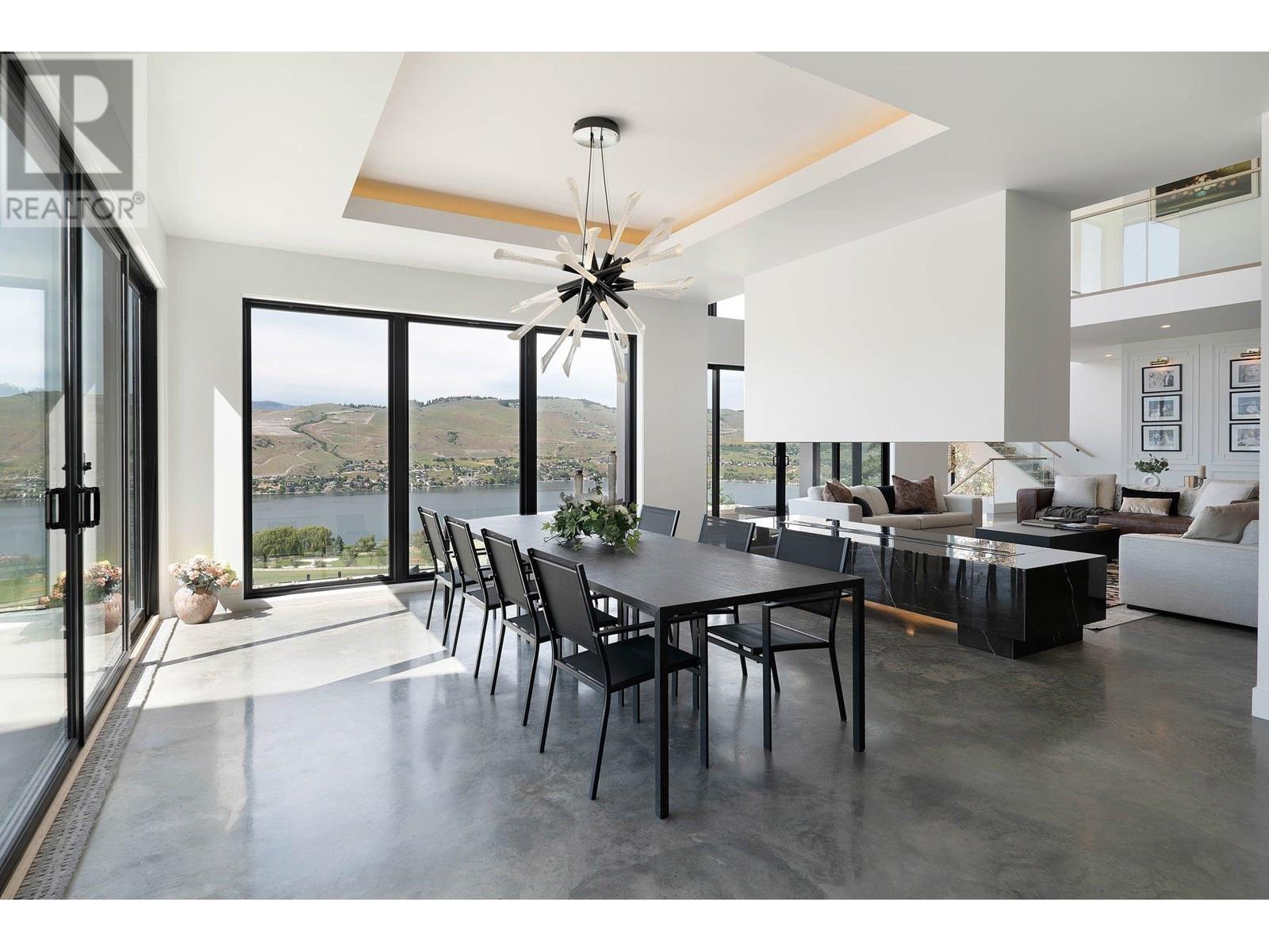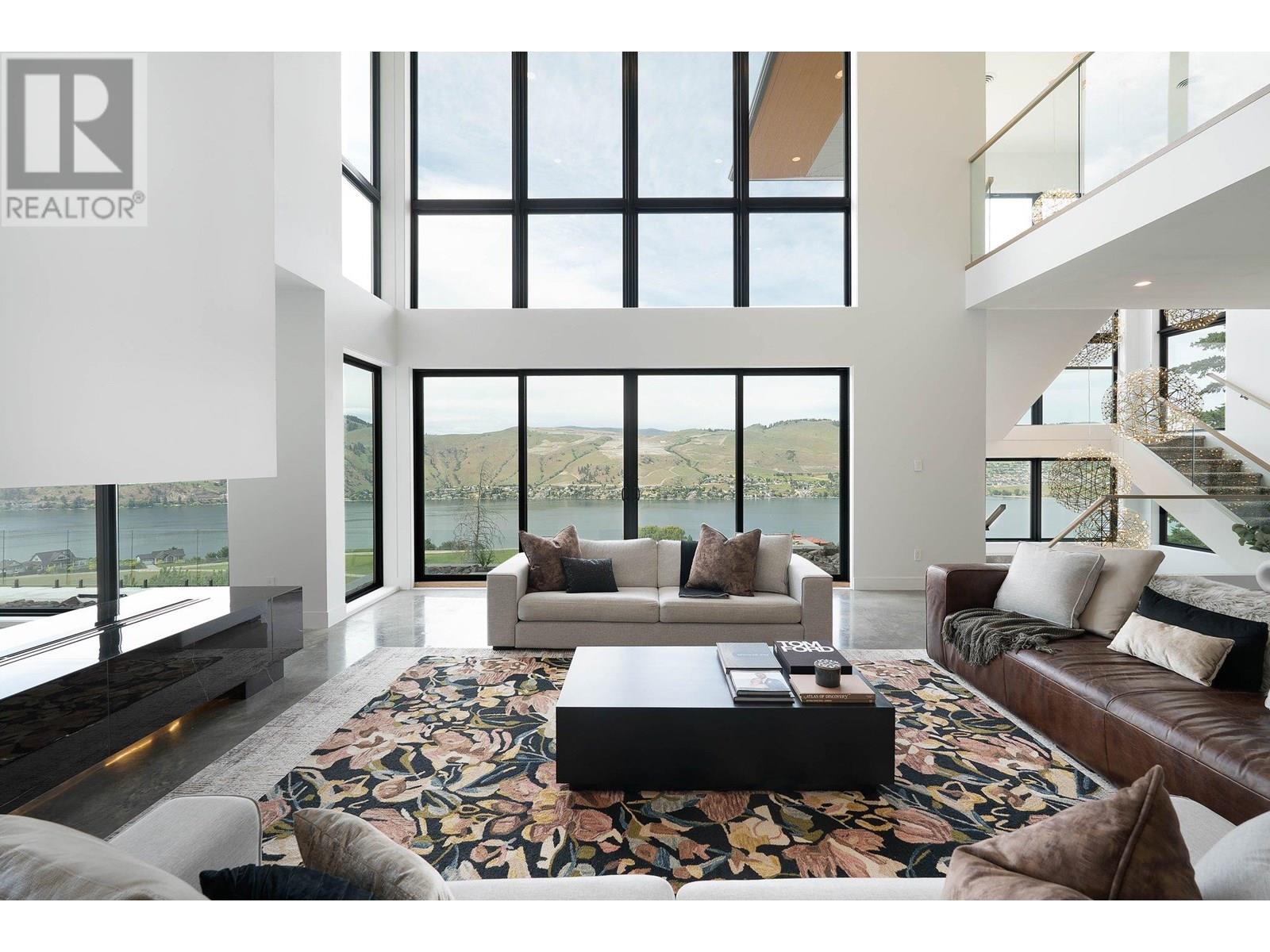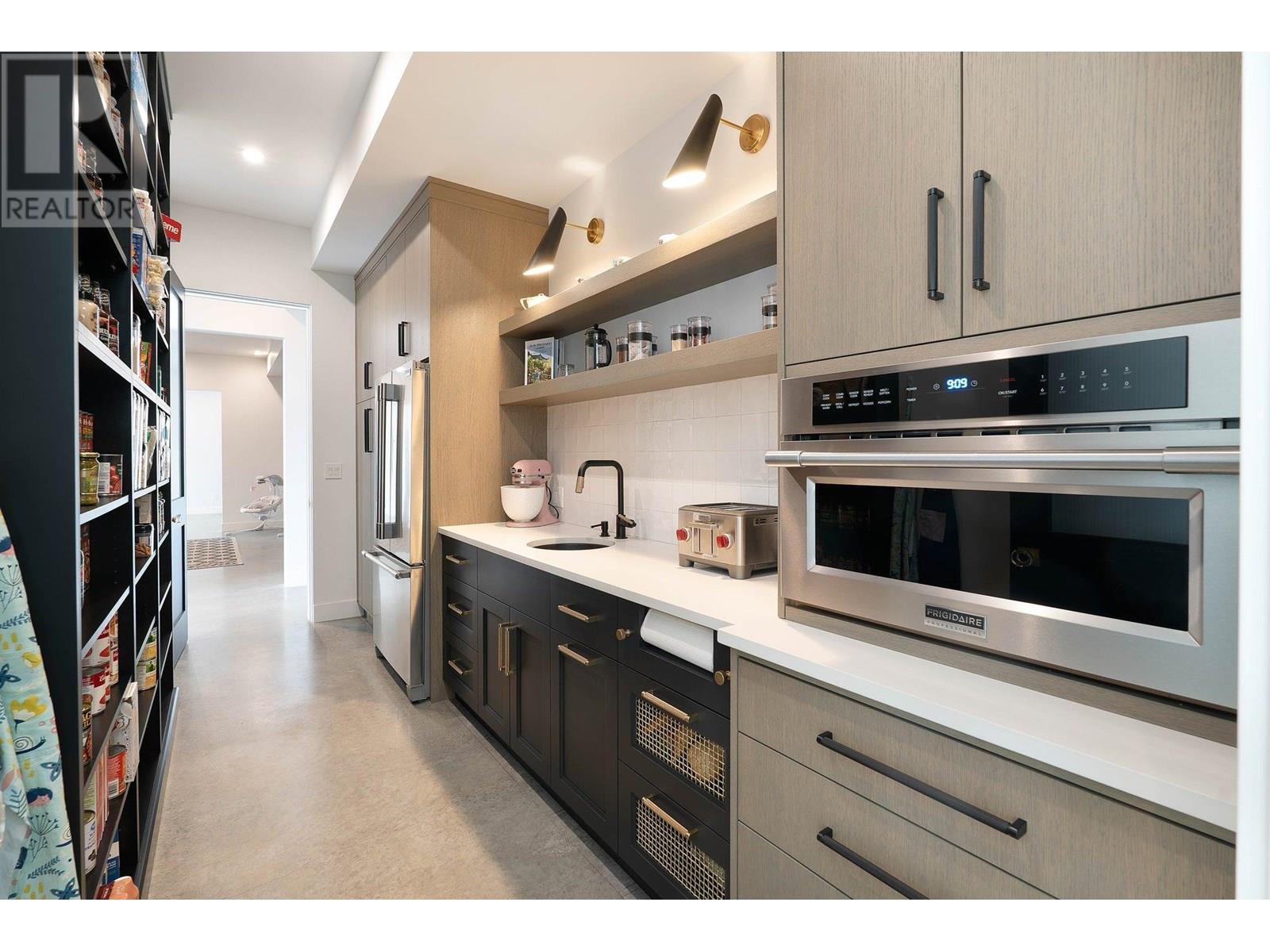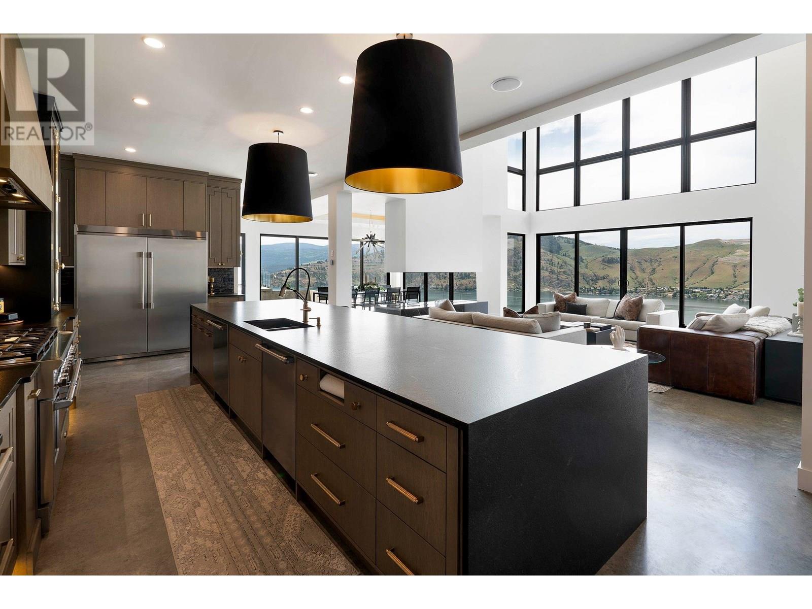 Welcome to Beverly Hills Estates! This modern luxury home sits on over 1 acre & spans over 9000 sq ft. The thoughtful design includes uninterrupted views of Okanagan lake & paradise ranch. The 3 car garage opens into a large mudroom. The Versace Elevator will take you up to the kitchen or bedrooms. If you take the stairs, you will see an incredible 3 story chandelier that cascades 20 ft! The kitchen features a 16 ft waterfall island with leathered granite, a 48” 8 burner range, 2 dishwashers, gorgeous hardware & built-ins. The pantry & wet bar offer ample storage, combi oven, fridge/freezer & ice makers. The great room features 22 ft ceilings with floor to ceiling windows & an 84” ethanol fireplace that connects to the dining room. A glass hall leads to the primary wing with sitting area, full bar, spa bath & dressing room with laundry. There is a second primary bedroom & 3 additional bedrooms, all with ensuites. All 5 bedrooms are on one level with a double laundry, open concept office & cigar lounge. The main floor offers a gym, theatre room and flex space. The designated pool house with in/out bath opens into the outdoor kitchen & offers a salt sauna & yoga/massage room. Heated floors, high end mechanical systems & desirable location make this home worth viewing! Located near the Vernon airport and on the perimeter of the SenseNet system installed by Predator Ridge. Fire response to this area has been trialed and is leading in forest fire response technology. (id:48970)