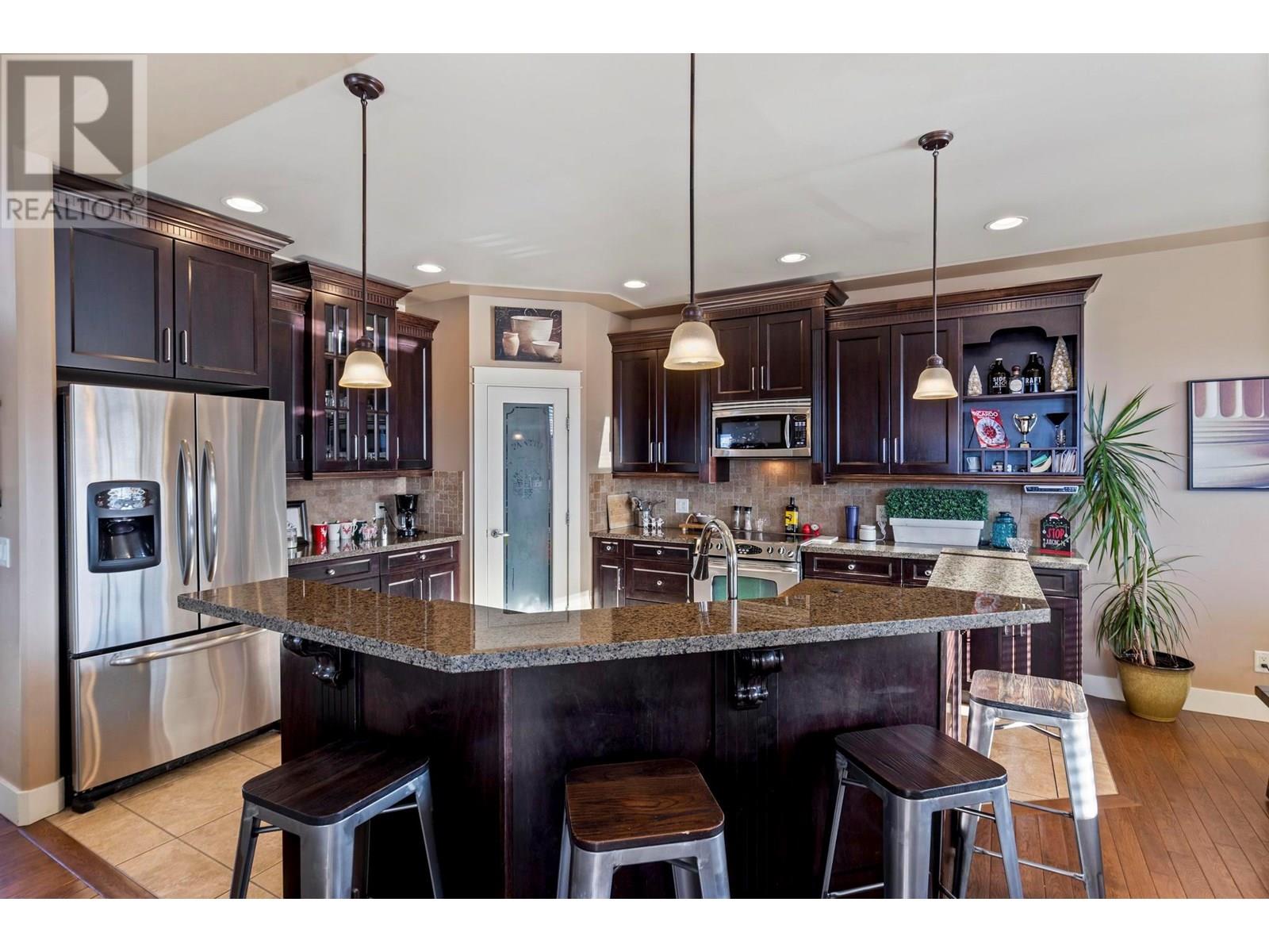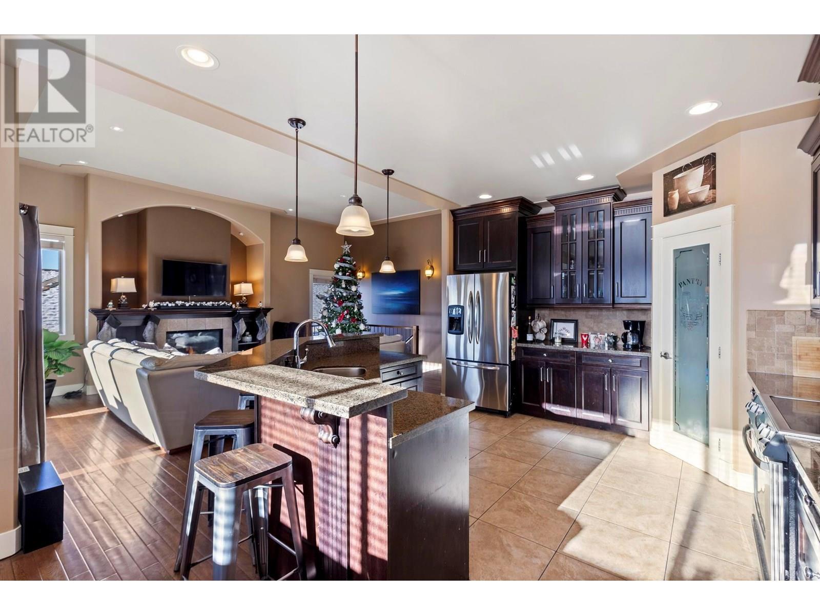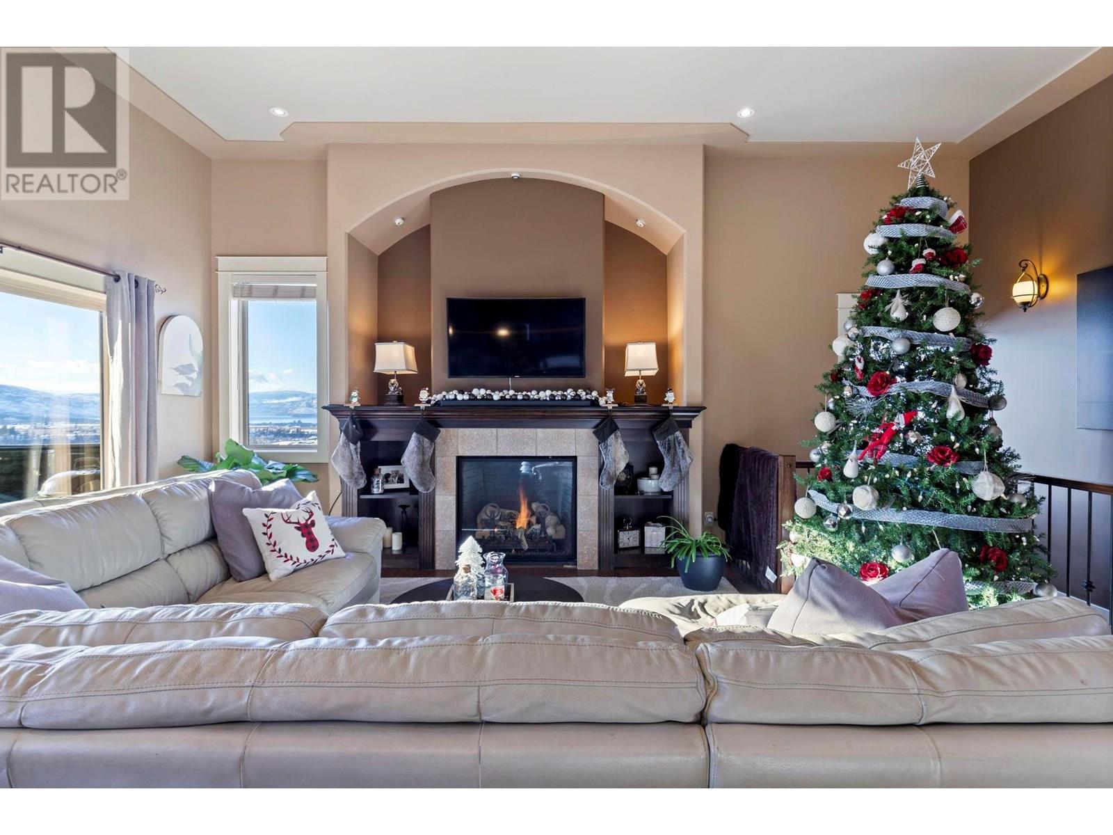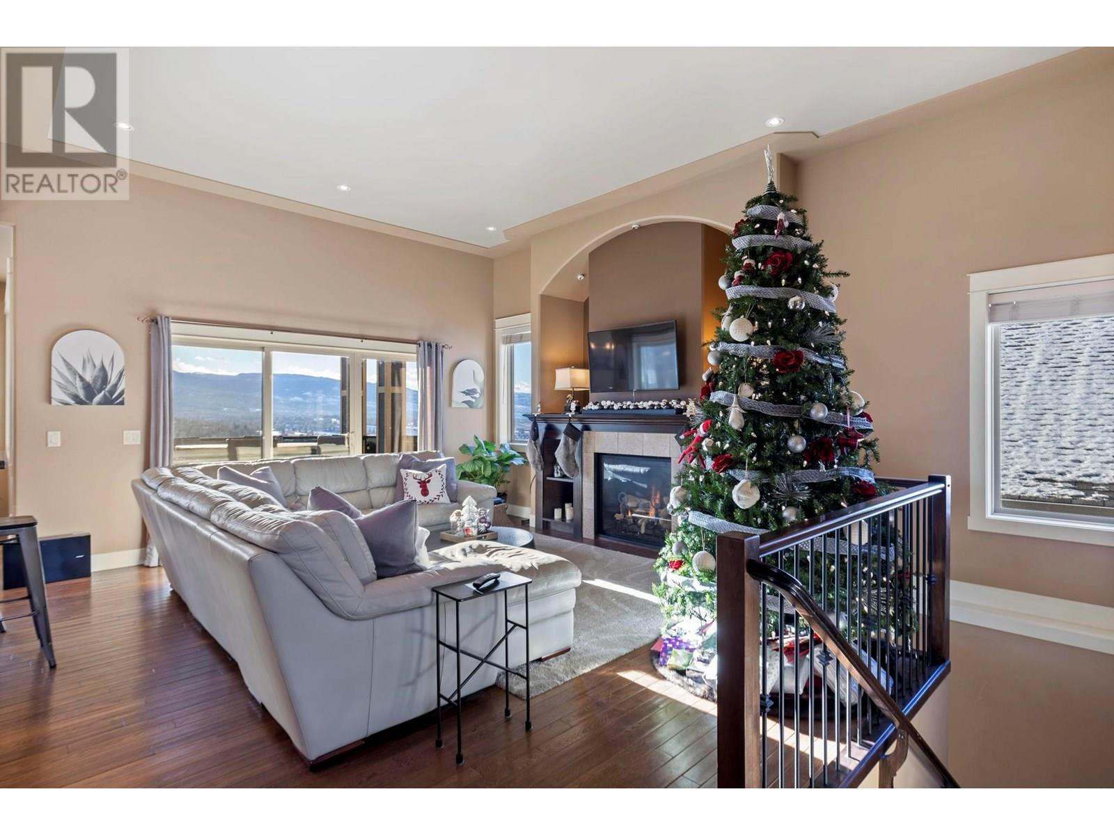 Enjoy amazing panoramic lake and city views from all 3 levels of this beautiful 4,300+ sqft 6 bedroom, 4 full bath custom walkout rancher including a 'sweet' additional fully finished lower 3rd floor walkout level with second kitchen, bedroom, large living area, bathroom, and second laundry. High quality finishes throughout include scraped oak hardwood floors on main, travertine tile, granite counter tops, extensive quality mill-work and trims with custom crafted built-ins accentuate the contemporary tones and bright open floor plan. Immediately you are greeted by tall ceilings and cascading light in the grand entry and great room featuring a majestic rock gas fireplace with wood built-ins. This opens to the gourmet maple kitchen with granite counters, walk in pantry, tons of cabinets, stainless steel appliances, eating area and covered deck showcasing the views. Enjoy a luxurious primary bedroom suite on main with tray ceiling, a spacious 5 piece ensuite bath, and large walk-in closet. Second bed & bath on main means guests can stay without using the stairs; or, could make a perfect Den / Office. The lower second level offers open family room area, 2/3 bedrooms, wet bar, and wired Media room (5th bedroom). A further 3rd lower floor is set up with a second kitchen, living areas, 1 bed, full bath, and second laundry. Oversized double garage and driveway for 4 or 5 cars! Low maintenance yard with no need for a lawn mower! This house is perfect for multi-generational living! (id:48970)