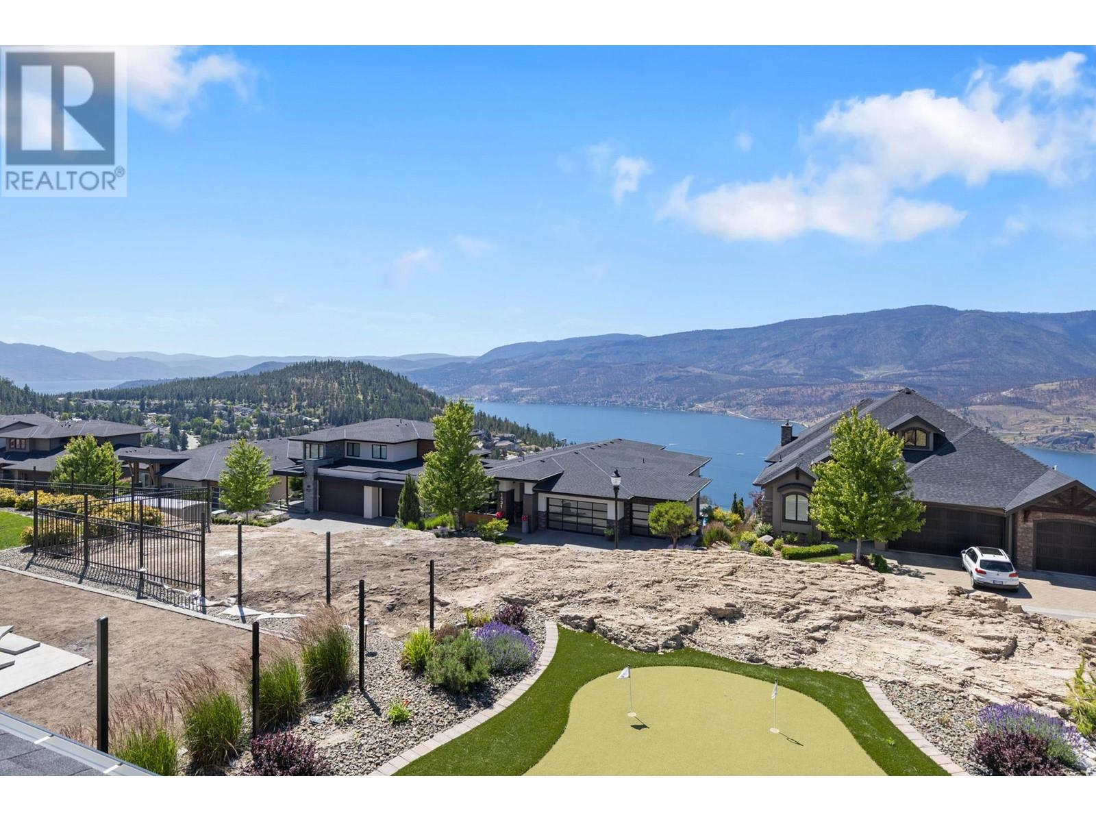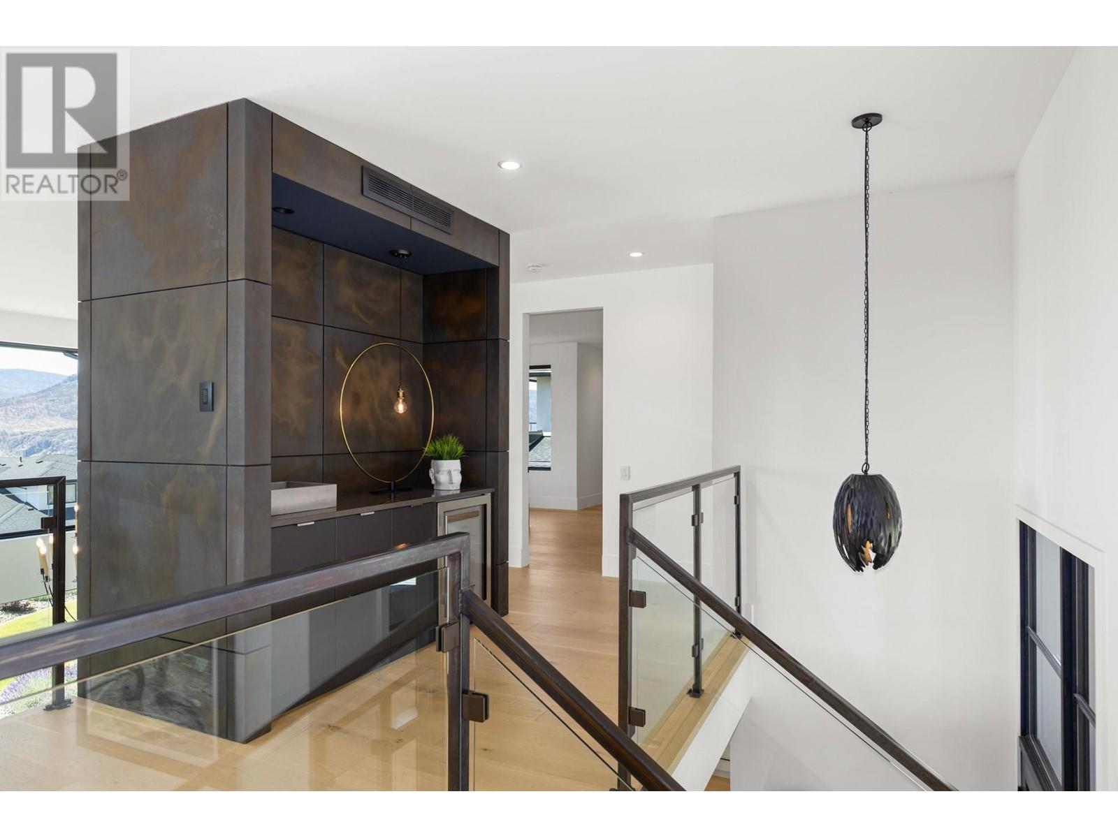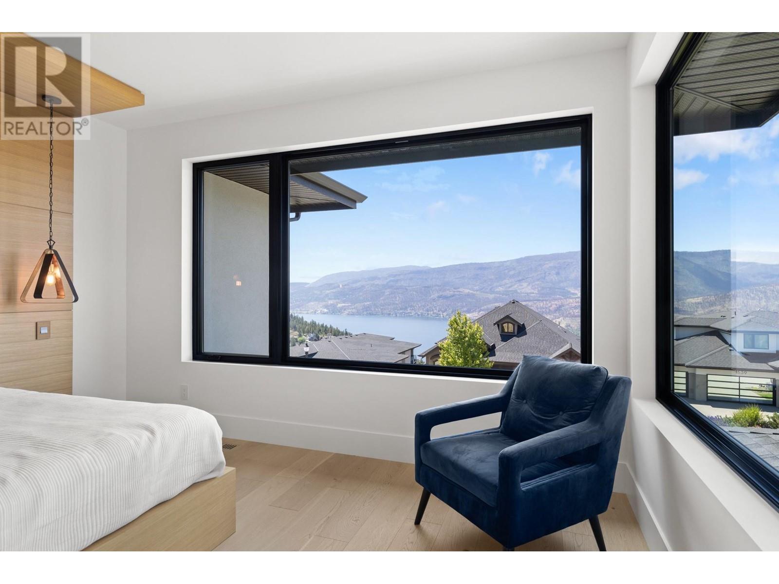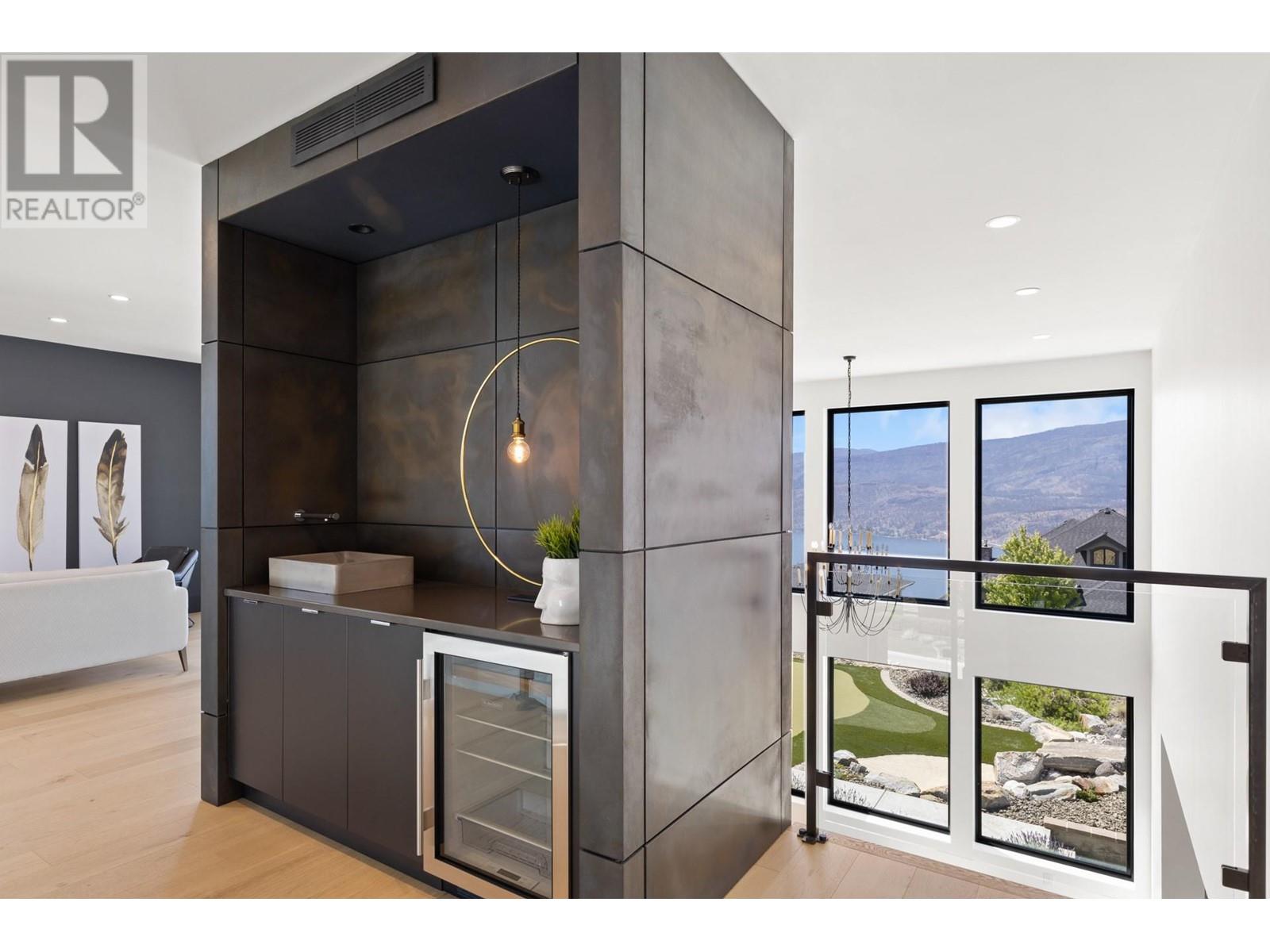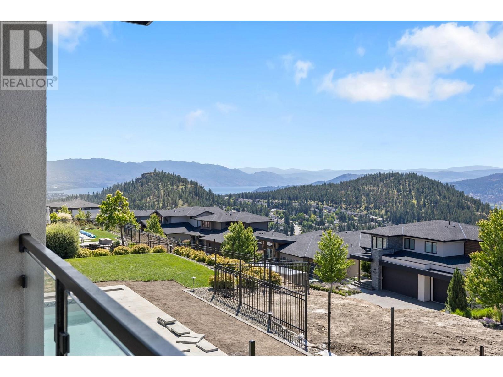 A unique opportunity in the prestigious Wilden neighbourhood, this custom built 2019 show home of the year from award winning builder Fawdry Homes will take your breath away w/sweeping 180 degree views of the Okanagan Lake + mountains.  Truly designed for entertaining, this 4 bedroom + den modern home offers an open main flr plan w/2 stories of great room windows framing the amazing views opening into the covered patio area merging into the meticulously maintained low maintenance rear yard.  Main flor features inc:  a large kitchen w/over-sized Wolf gas range, panel Sub-Zero fridge/freezer, pantry/mudroom w/tons of storage, wet bar w/beverage fridge, 2 storey linear gas fireplace, spacious great room, 3 piece bath + office/future bedroom. Upper flr offers a lg primary suite w/built-in custom bed, his/her walk-in closet, a spacious ensuite w/lg soaker tub + curbless tiled shower, left style TV area, wet bar, 1/2 bath + the lg covered deck to soak in the sweeping views.  Bsmt offers 2 full bedrooms, a 3 piece bathroom, wet bar/kitchen area however with the open design + lg windows, the potential for additional bedrooms.  Basement also offers a separate grade to basement level entrance which would all for a possible suite.  Other features include a 3 car garage, advanced heating/cooling system, underground sprinklers, solar panel system, full central vacuum w/hidden hose attachments + full security/camera system.  Full New Home Warranty inlcuded.  Potential for a pool. (id:48970)