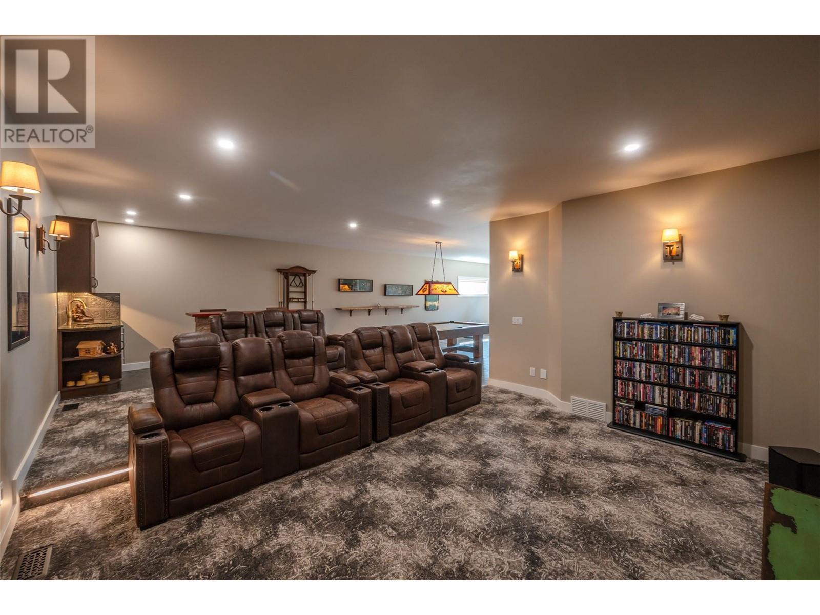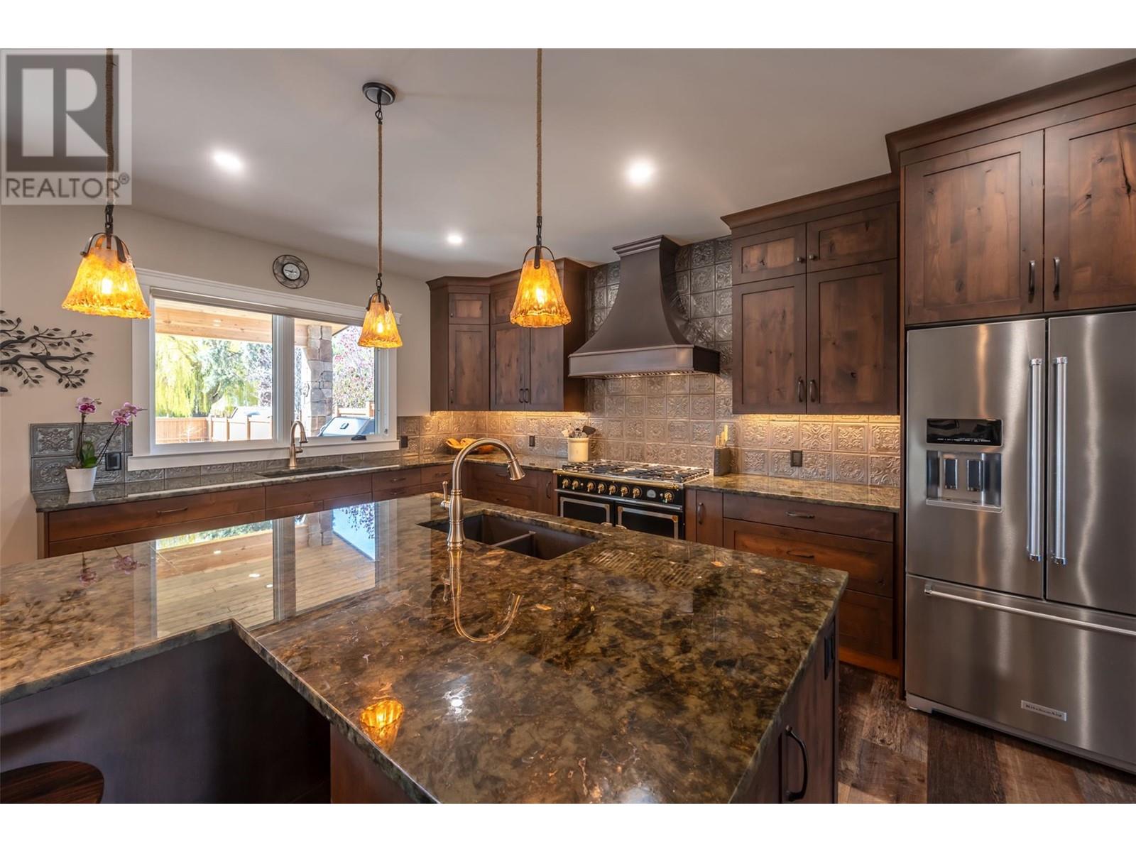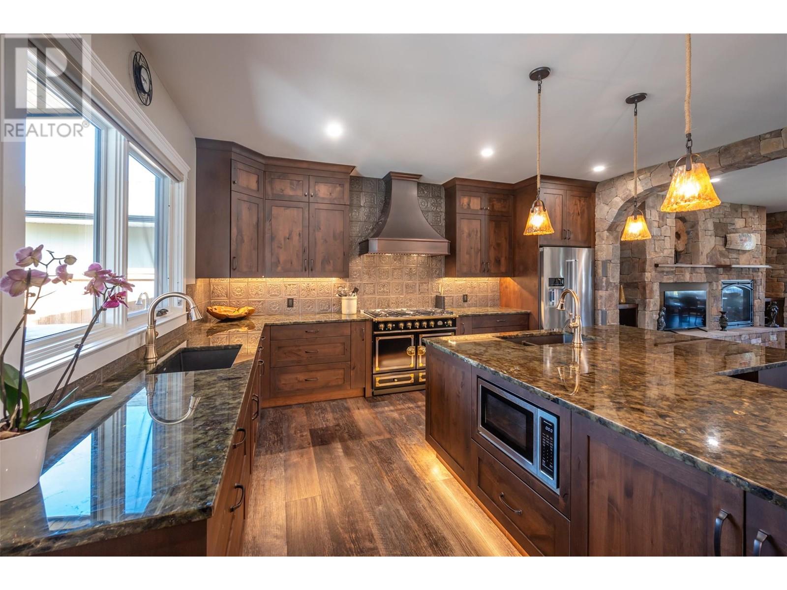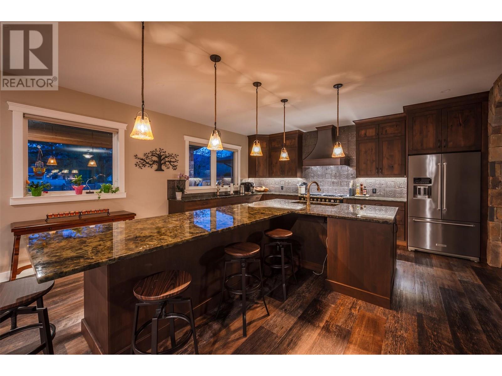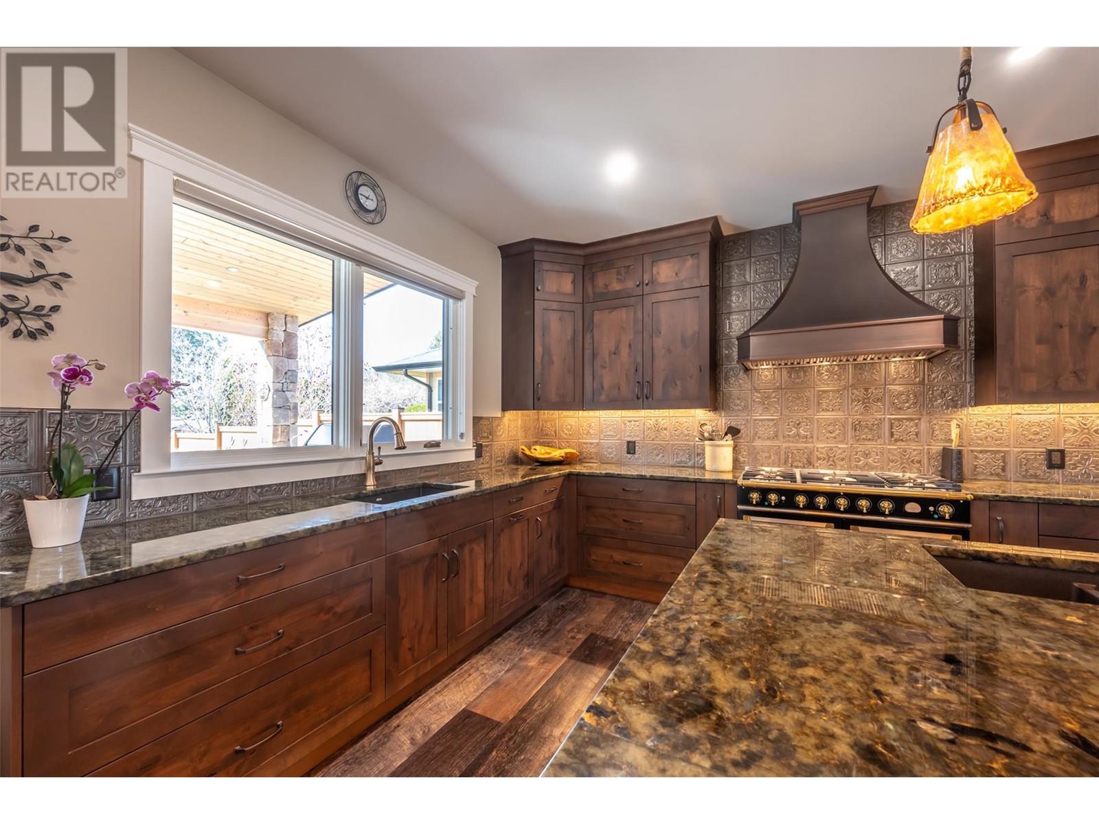 The complete package, welcome to luxury living at its finest in Trout Creek, Summerland. Built in 2021, this one-of-a-kind home is a dream come true for a car enthusiasts & those who appreciate exquisite craftsmanship. The main floor welcomes you to the dining & living rooms, featuring a gas fireplace w/walnut mantle & stone wall. Prepare to be amazed by the spacious chef's kitchen, equipped w/ custom alder solid wood cabinets, azul granite counters & oversized island. La Comue 110 dual fuel oven is a chef's delight. Custom stone wine room w/solid walnut door & temperature-controlled chilling for your wine collection. Den & 2 piece bath w/wine barrel cabinet & copper sink. Radiant in-floor heating ensures comfort throughout the entire home. Upstairs primary bedroom, complete w/ ensuite w/a custom tile shower, dual sinks & spacious walk-in closet w/stacking washer/dryer. Two additional bedrooms each w/ walk-in closets & full ensuites. Rec room is an entertainment hub, home theatre w/ stepped seating, wet bar, pool table & flex space & 2- piece bath. Step outside to your back patio w/ a full outdoor kitchen, perfect for entertaining. Hot tub completes the package. Multiple parking options w/ an oversized double garage & 3-bay shop. Above the shop is a legal 1-bed, 1 bath carriage house. This home must be experienced in person to be fully appreciated. Book your showing today. (id:48970)