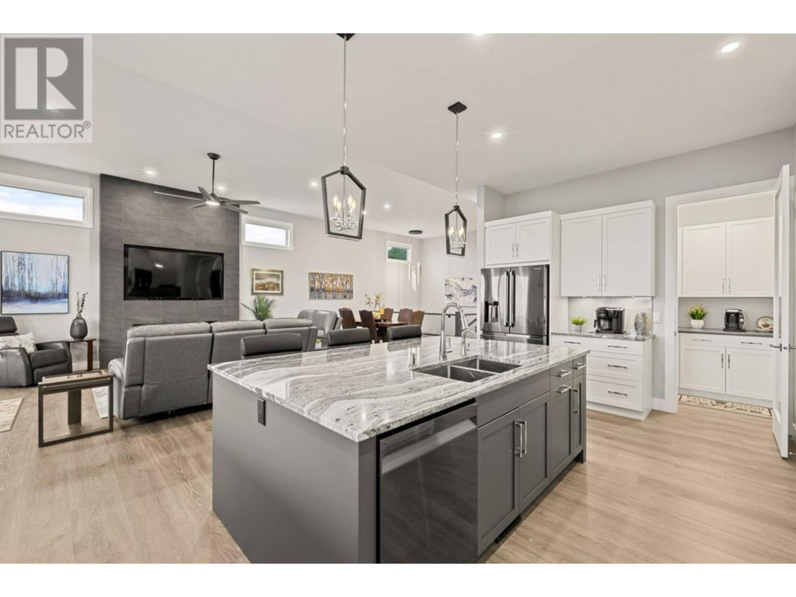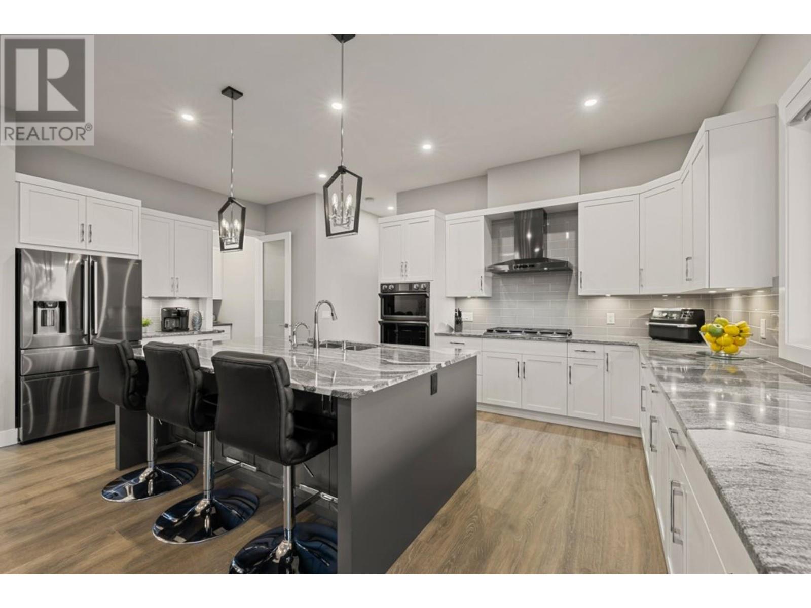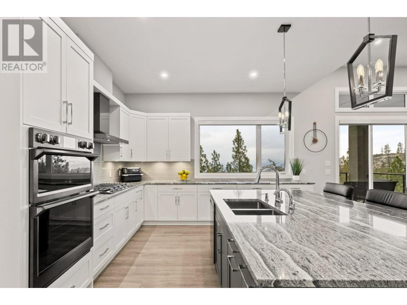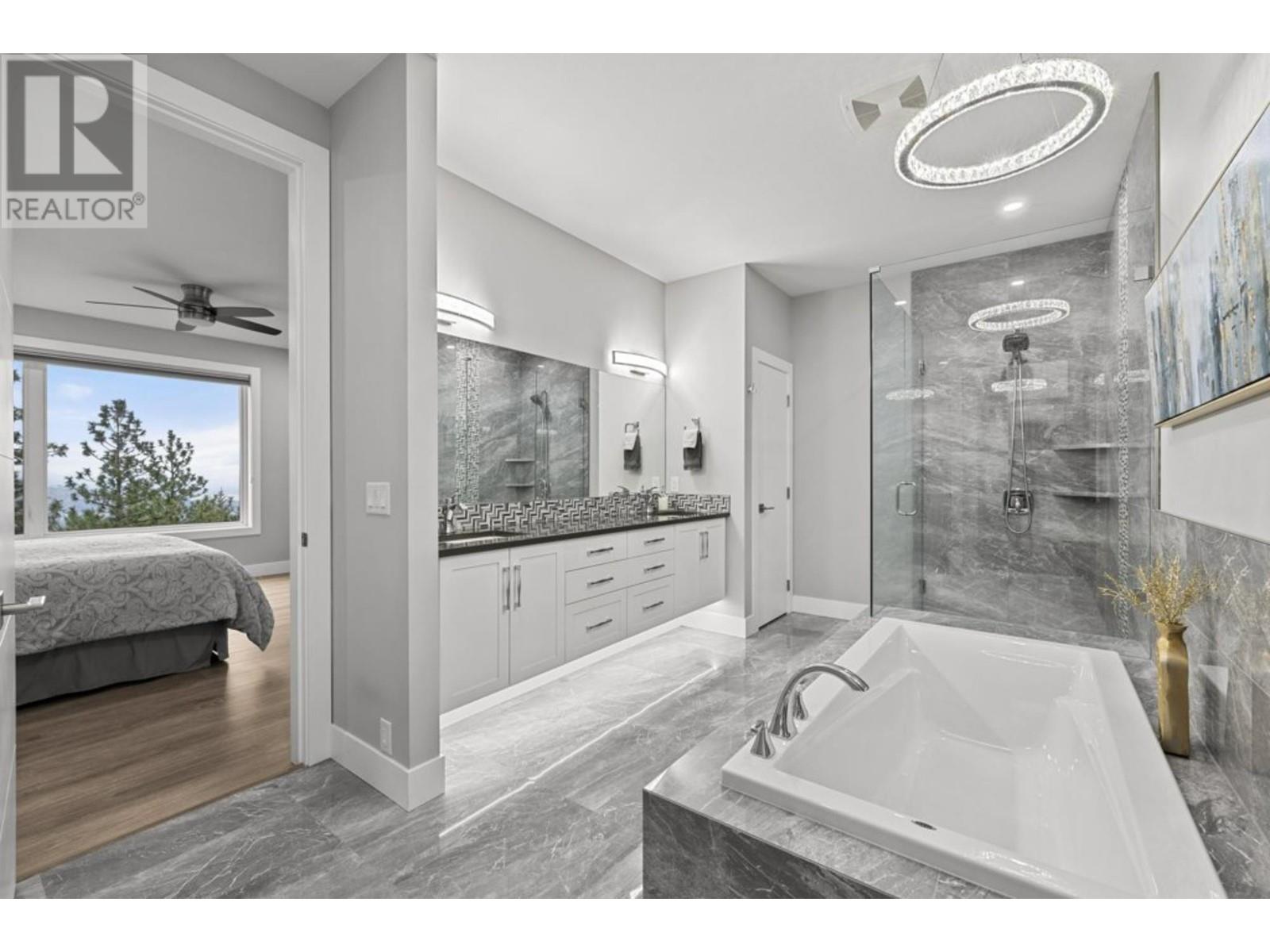 Custom built home by multiple award winning Operon Homes. This spacious 5-bedroom, 5-bathroom home seamlessly blends luxury & functionality. Featuring an elevator, 900 sq. ft. heated garage & versatile 600 sq. ft. heated flex room with 220V—perfect for a workshop. A 1 bedroom legal suite with laundry hookups & private entry adds value. The main level impresses with 12 ft ceilings, 8 ft doors & an open concept. The great room is highlighted by a floor-to-ceiling gas fireplace with TV recess. The chef’s kitchen boasts a gas cooktop, 5x8 ft. island with cabinetry & butler’s pantry. The home is equipped with a whole-home water filtration/softener system, reverse osmosis kitchen faucet & built-in vacuum. The spacious primary bedroom features a luxurious ensuite with heated floors, a separate water closet & expansive walk-in closet with direct access to the laundry. A 2nd bedroom & guest bathroom with a tiled shower are also on the main floor. The lower level includes the suite, the flex room, 2 additional bedrooms (one with walk-in closet & ensuite), a full bathroom, a large family room, storage & private patio with hot tub. The garage accommodates 3+ cars with a 12-ft ceiling, 220V outlet, hot/cold water & built-in cabinets. The home’s low-maintenance exterior & expansive upper deck overlooks the view & oversized lot, ensuring privacy with no future development behind you. Located in a quiet cul-de-sac, enjoy easy access to shopping, lakes, golf, wineries & numerous trails. (id:48970)