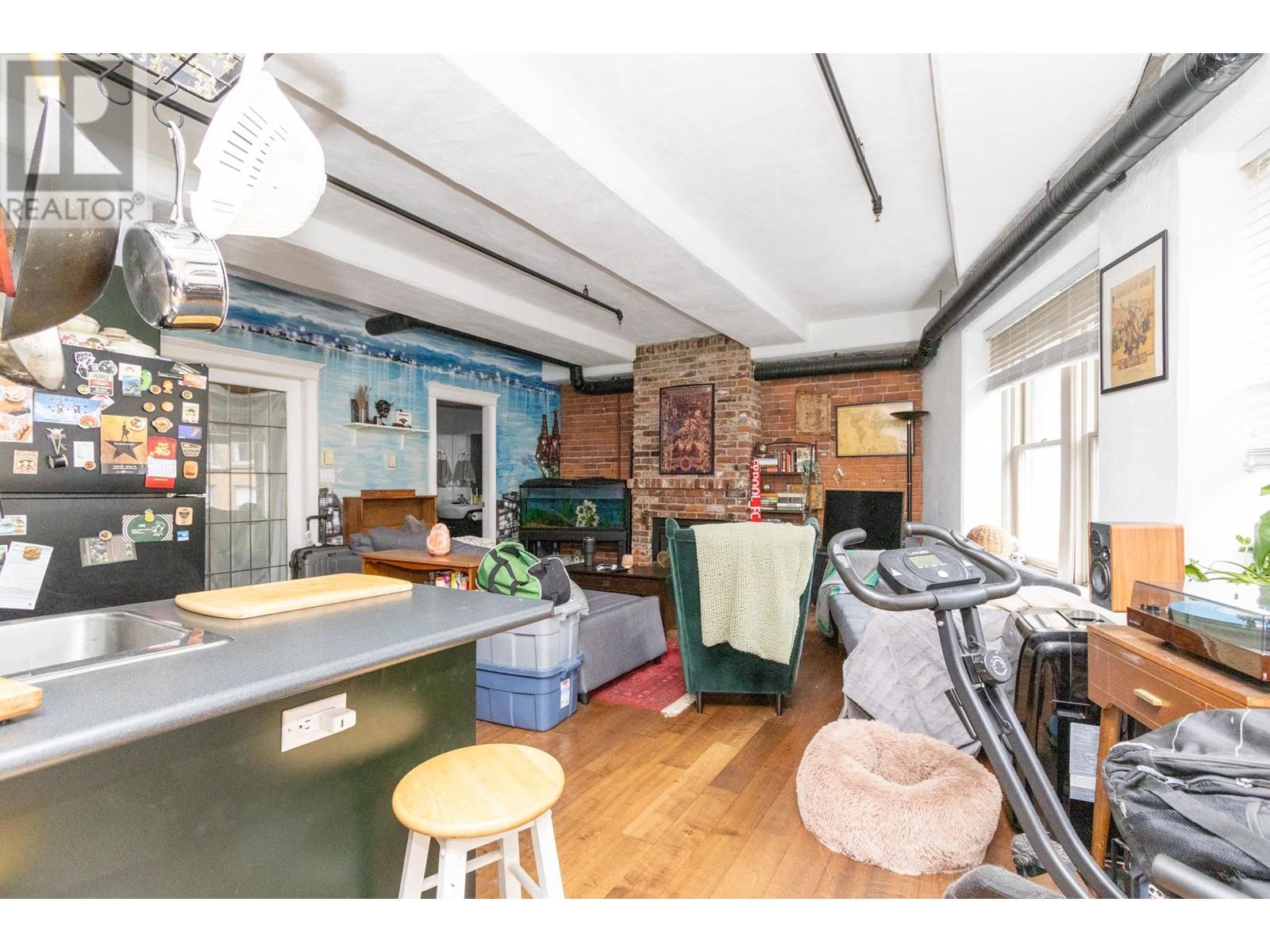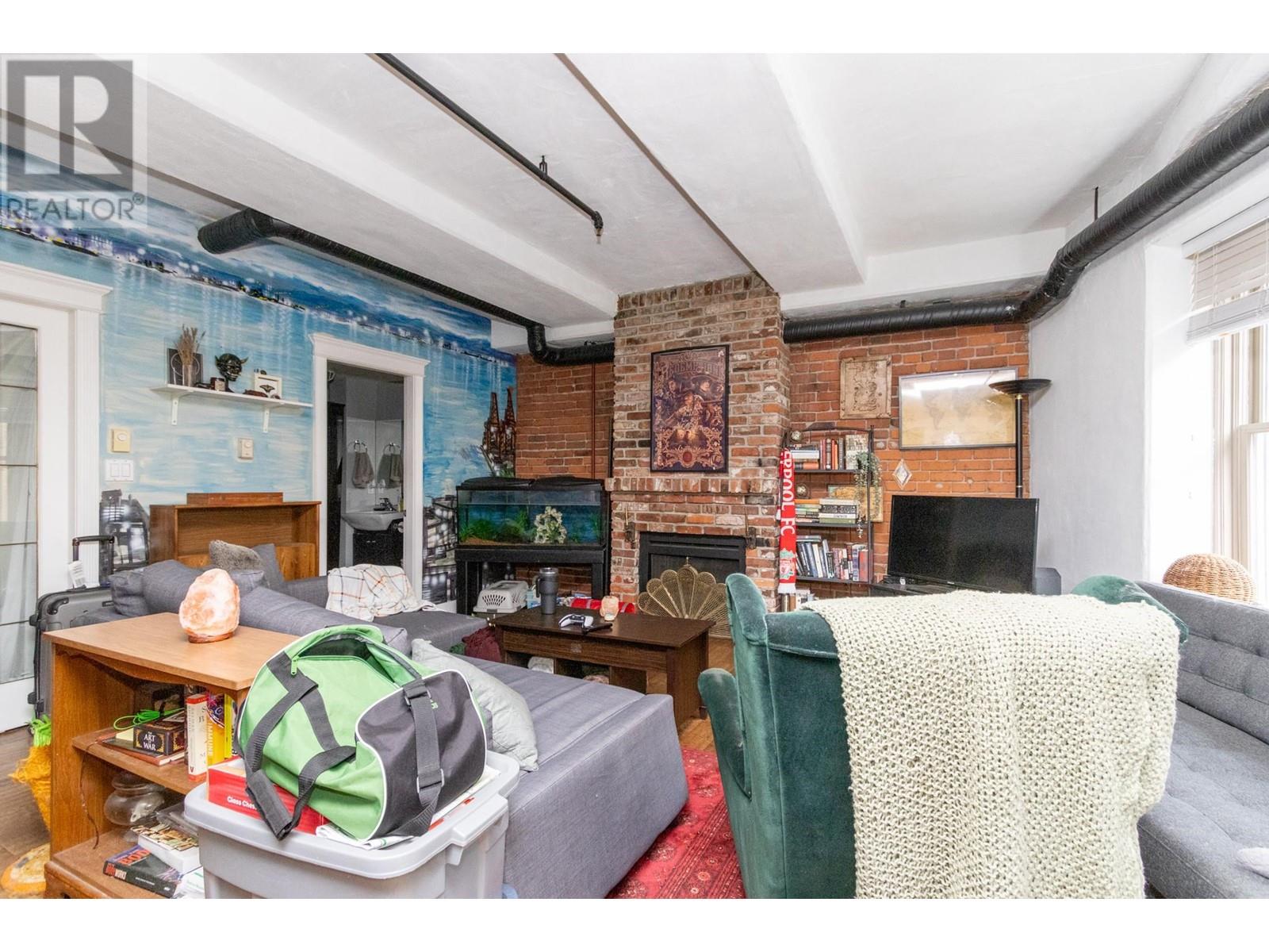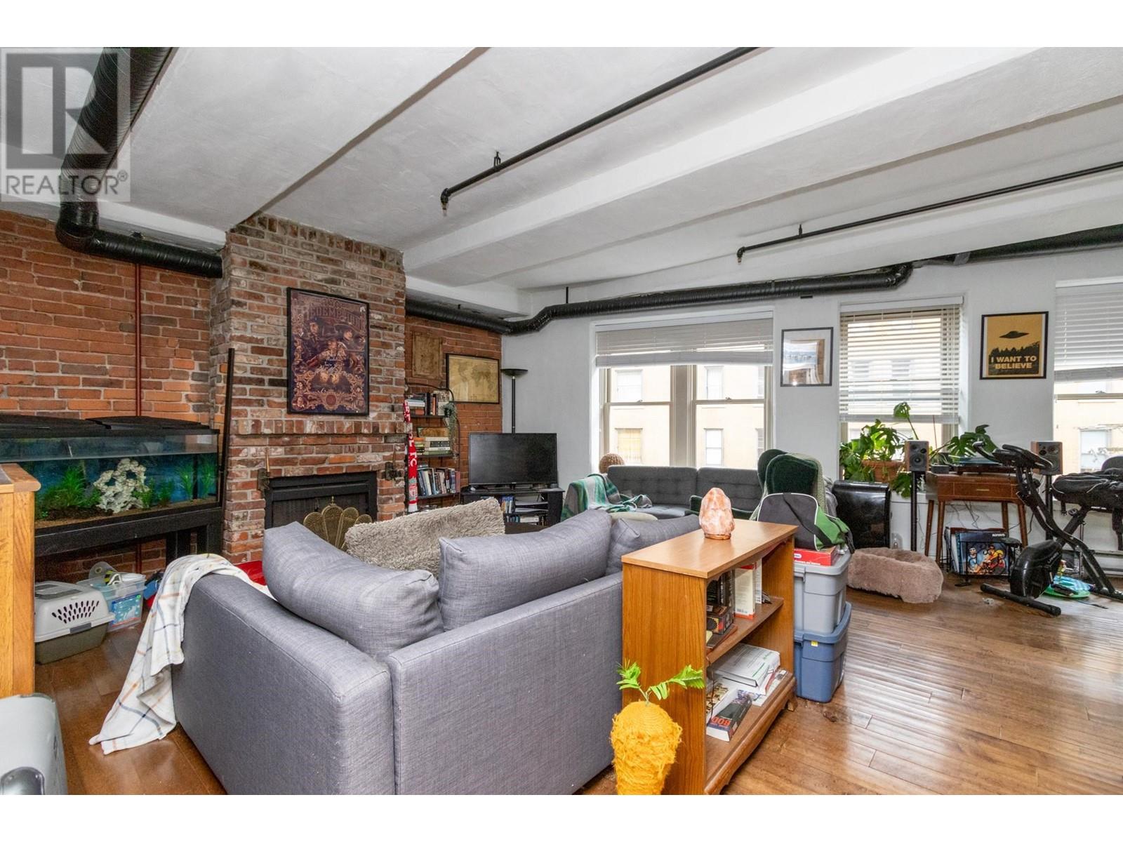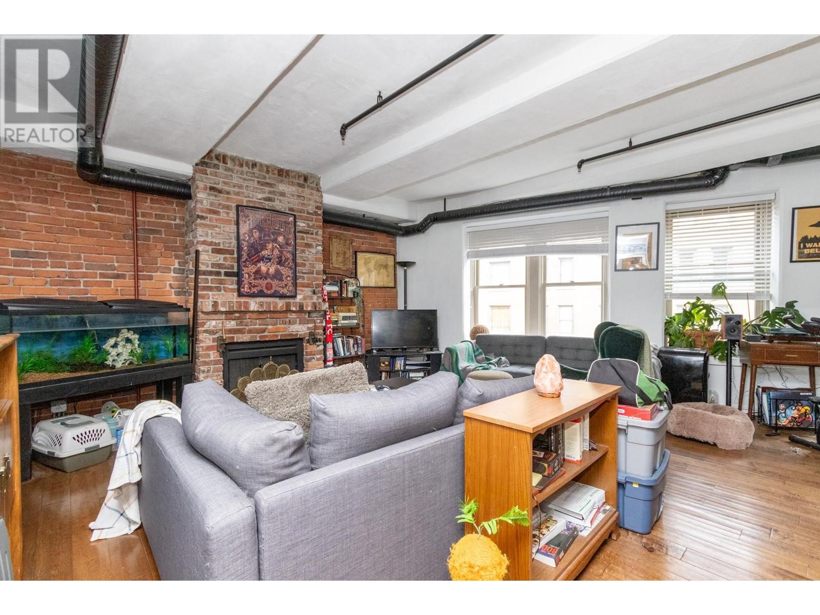 Welcome to the Alexander, an award winning heritage restoration in Gastown that perfectly blends contemporary living with old world charm. This south facing unit looks onto the peaceful street-calmed Alexander St and Maple Square and boasts a multitude of windows and natural light. The unique wide layout opens up as you enter giving a sense of space and airiness. There is lots of character here including exposed brick walls, hardwood and concrete floors plus a cozy brick gas fireplace. The living room boast a wall mural commissioned by renowned street artist Ken Foster that reimagines the northern views of North Vancouver skyline and Vancouver's working harbour. The open plan kitchen has all stainless steel appliances and includes a gas range and dishwasher. Separate bedroom plus in-suite laundry. Storage locker down. Rooftop common area patio with bbq, loungers and stunning water and mountain views. Storage locker. Sorry, no parking spot  in the building but parking is available for rent in the neighbourhood. (id:48970)