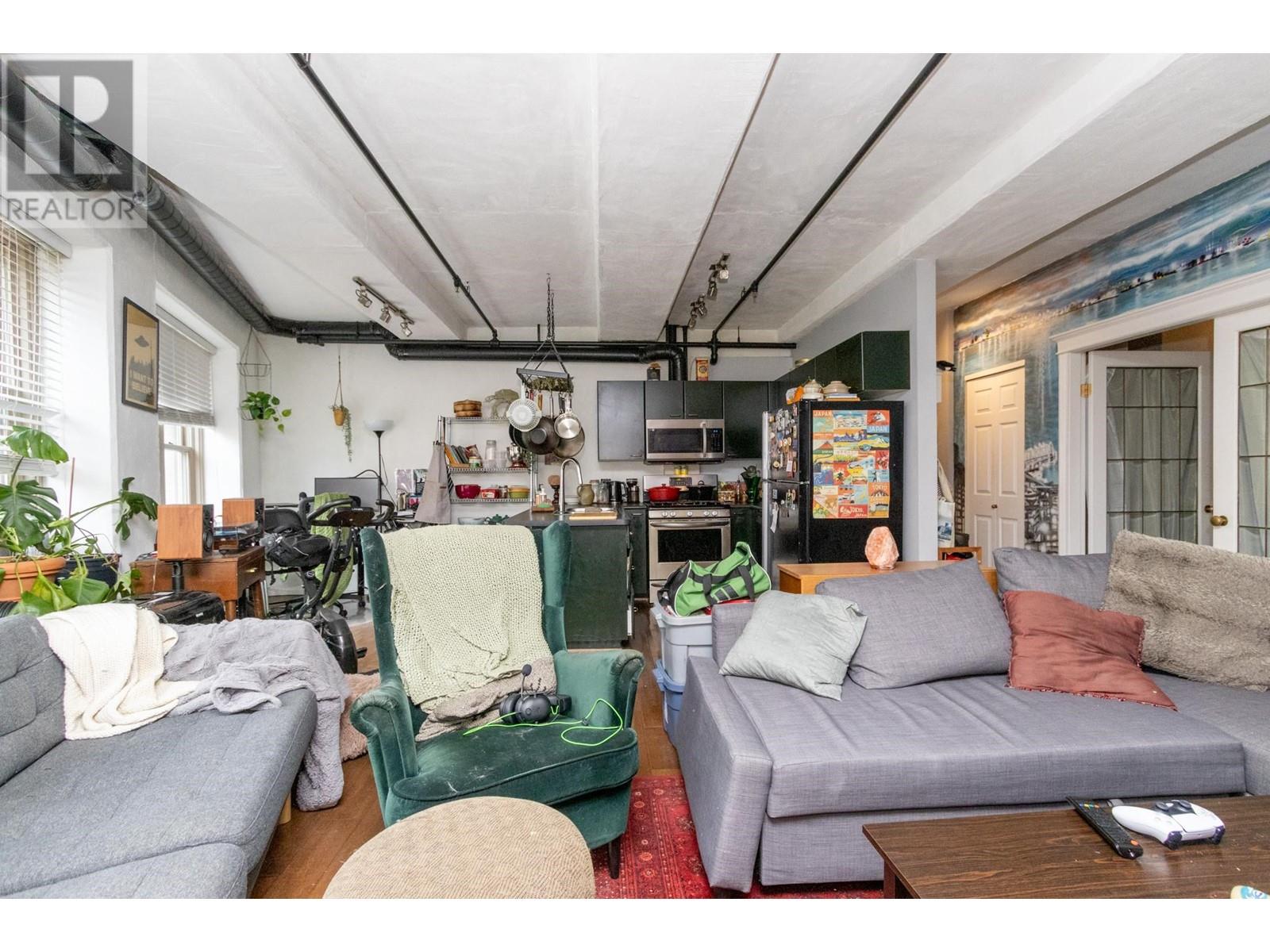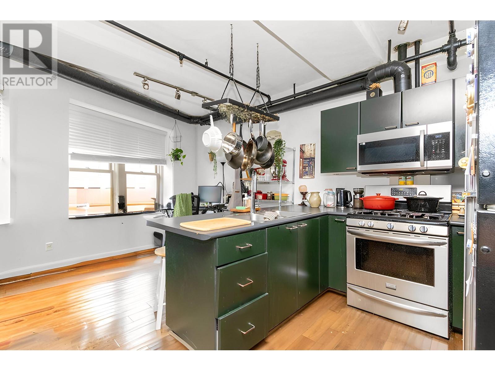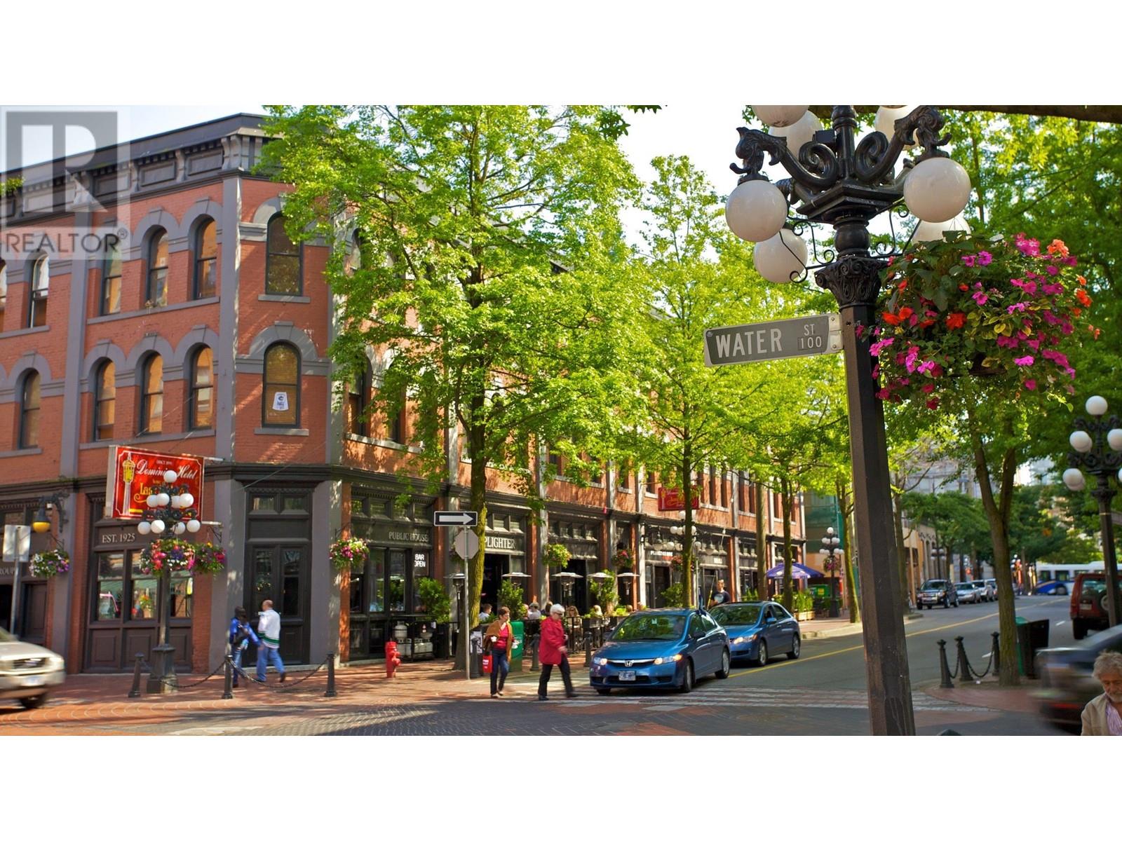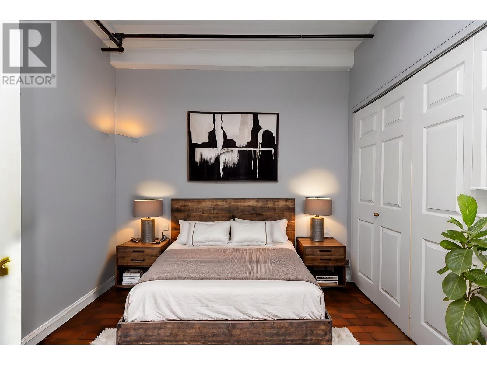 Welcome to the Alexander, an award winning heritage restoration in Gastown that perfectly blends contemporary living with old world charm. This south facing unit looks onto the peaceful street-calmed Alexander St and Maple Square and boasts a multitude of windows and natural light. The unique wide layout opens up as you enter giving a sense of space and airiness. There is lots of character here including exposed brick walls, hardwood and concrete floors plus a cozy brick gas fireplace. The living room boast a wall mural commissioned by renowned street artist Ken Foster that reimagines the northern views of North Vancouver skyline and Vancouver's working harbour. The open plan kitchen has all stainless steel appliances and includes a gas range and dishwasher. Separate bedroom plus in-suite laundry. Storage locker down. Rooftop common area patio with bbq, loungers and stunning water and mountain views. Storage locker. Sorry, no parking spot  in the building but parking is available for rent in the neighbourhood. (id:48970)