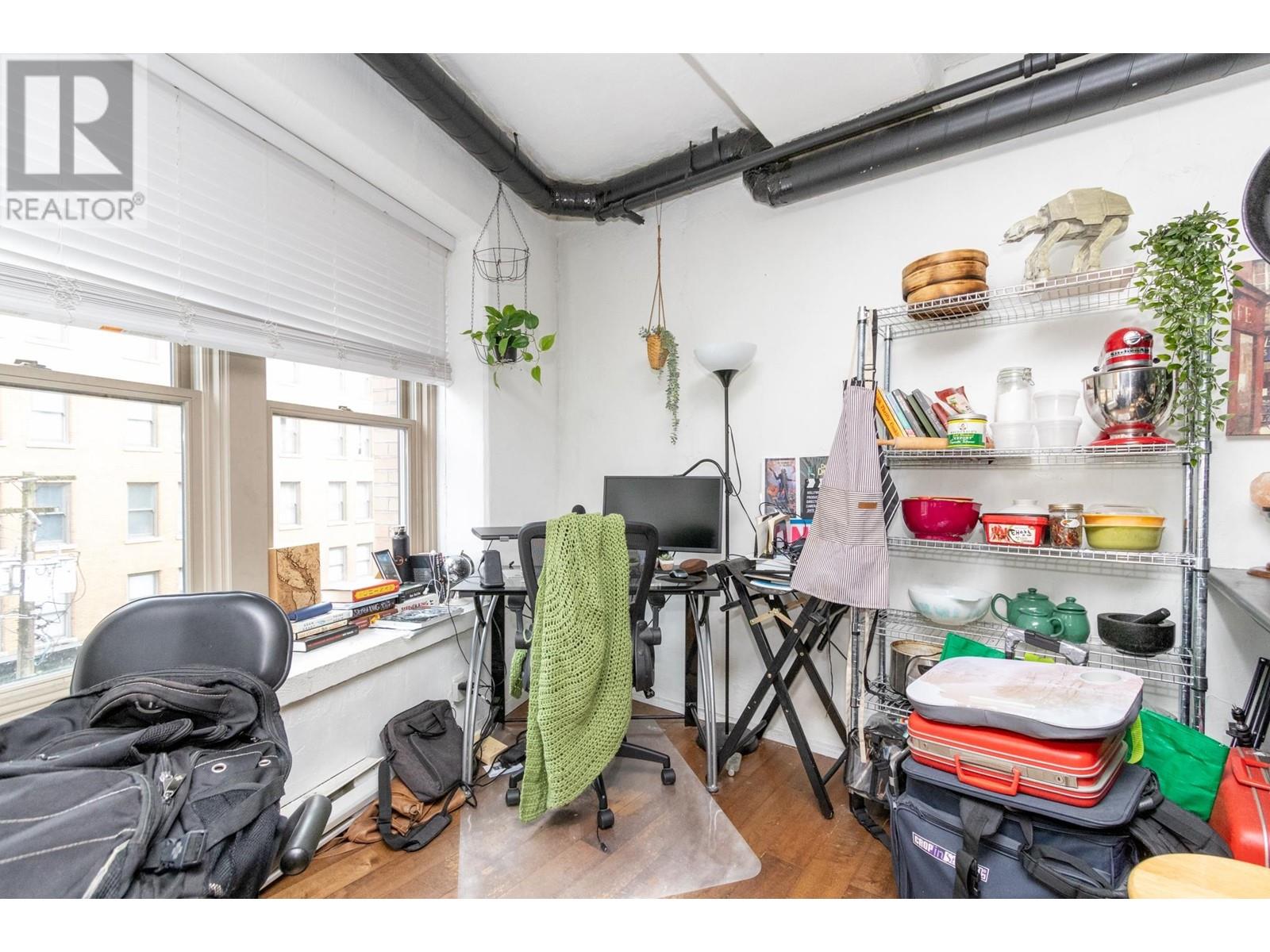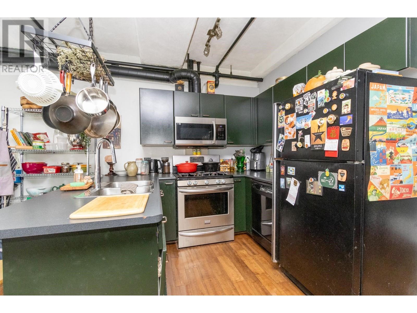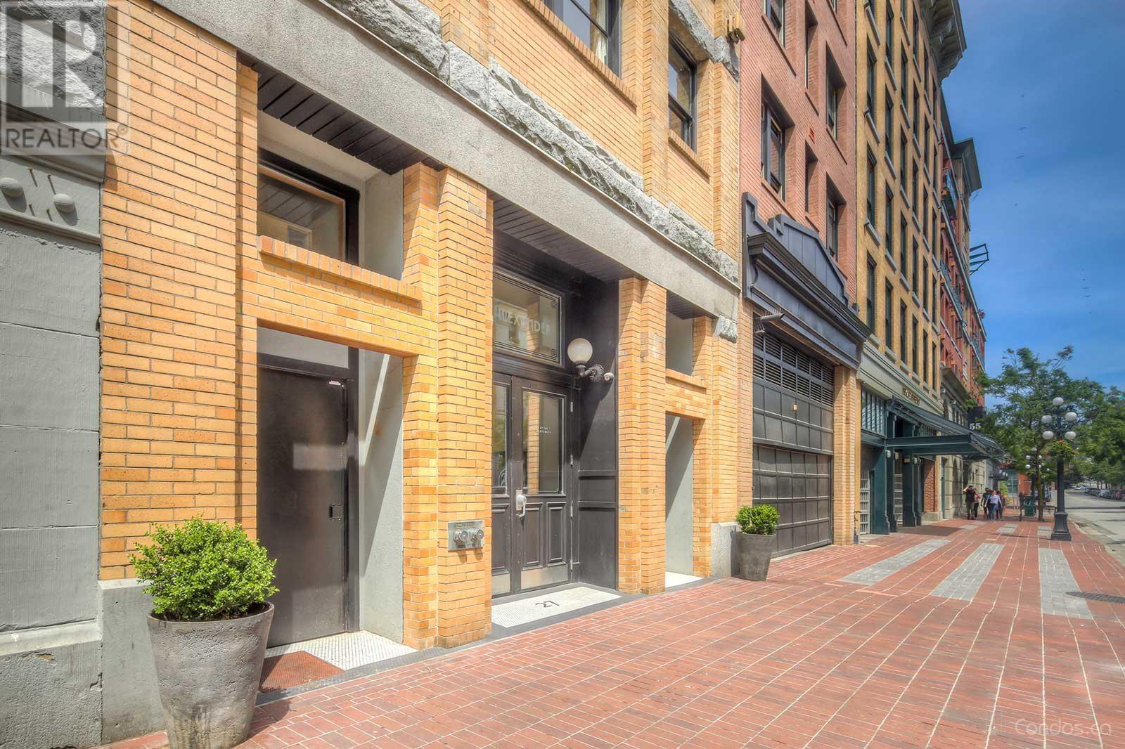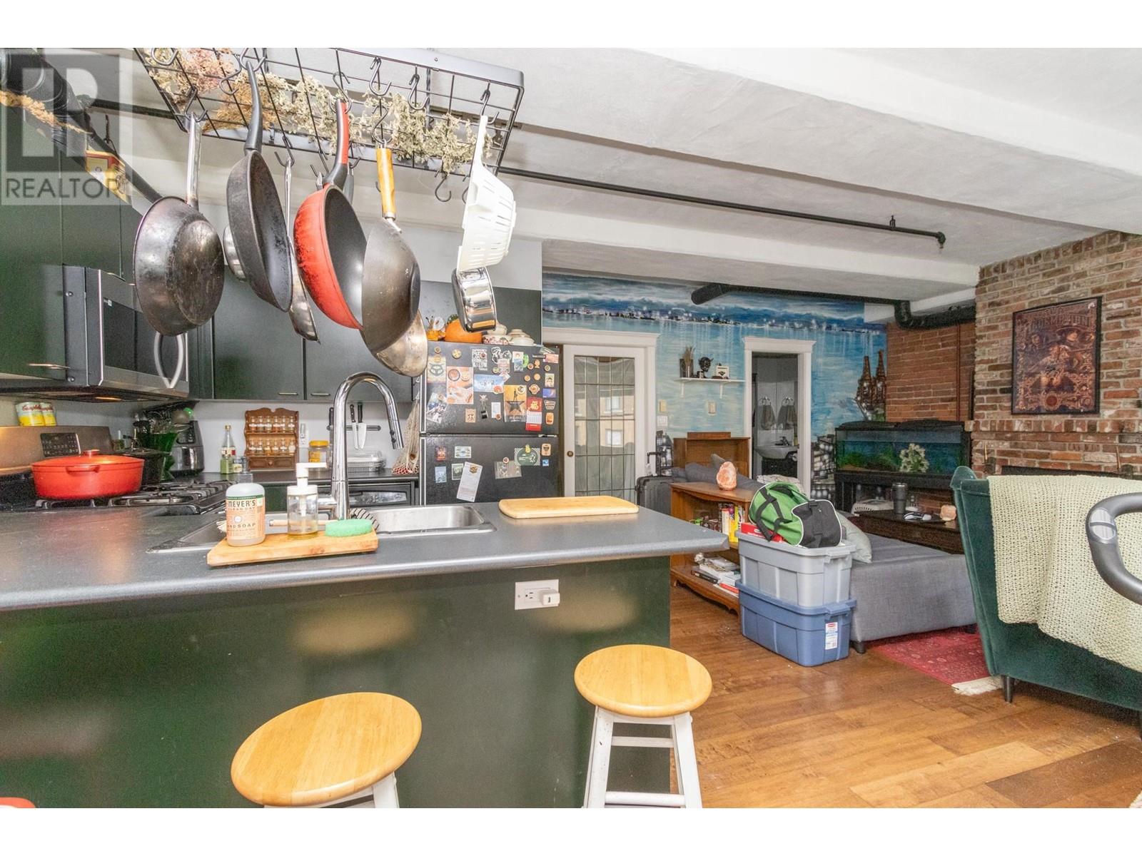 Welcome to the Alexander, an award winning heritage restoration in Gastown that perfectly blends contemporary living with old world charm. This south facing unit looks onto the peaceful street-calmed Alexander St and Maple Square and boasts a multitude of windows and natural light. The unique wide layout opens up as you enter giving a sense of space and airiness. There is lots of character here including exposed brick walls, hardwood and concrete floors plus a cozy brick gas fireplace. The living room boast a wall mural commissioned by renowned street artist Ken Foster that reimagines the northern views of North Vancouver skyline and Vancouver's working harbour. The open plan kitchen has all stainless steel appliances and includes a gas range and dishwasher. Separate bedroom plus in-suite laundry. Storage locker down. Rooftop common area patio with bbq, loungers and stunning water and mountain views. Storage locker. Sorry, no parking spot  in the building but parking is available for rent in the neighbourhood. (id:48970)