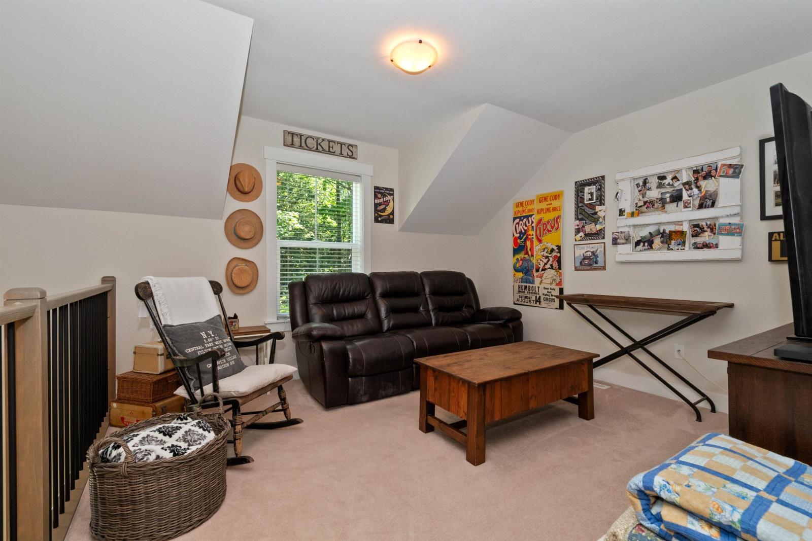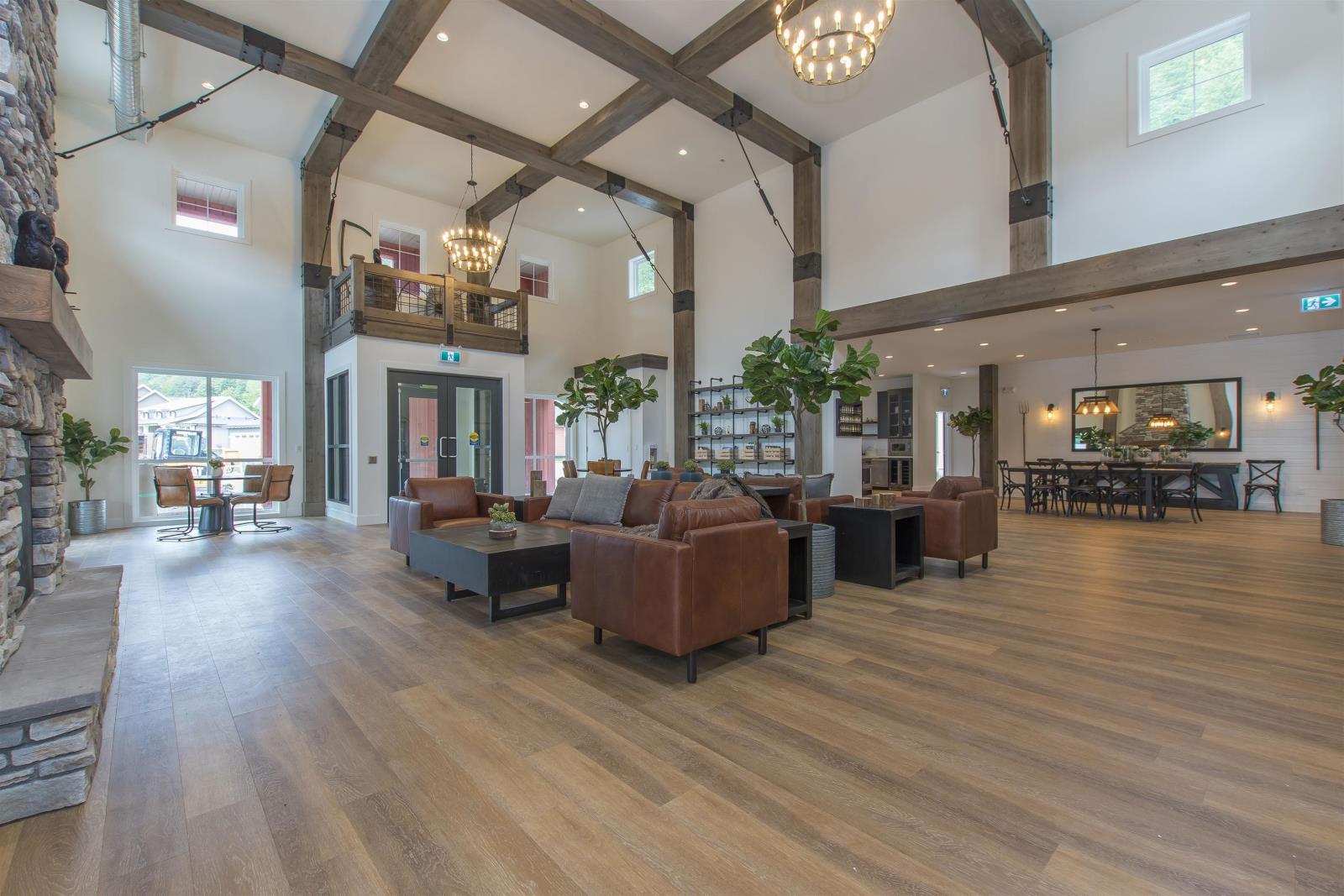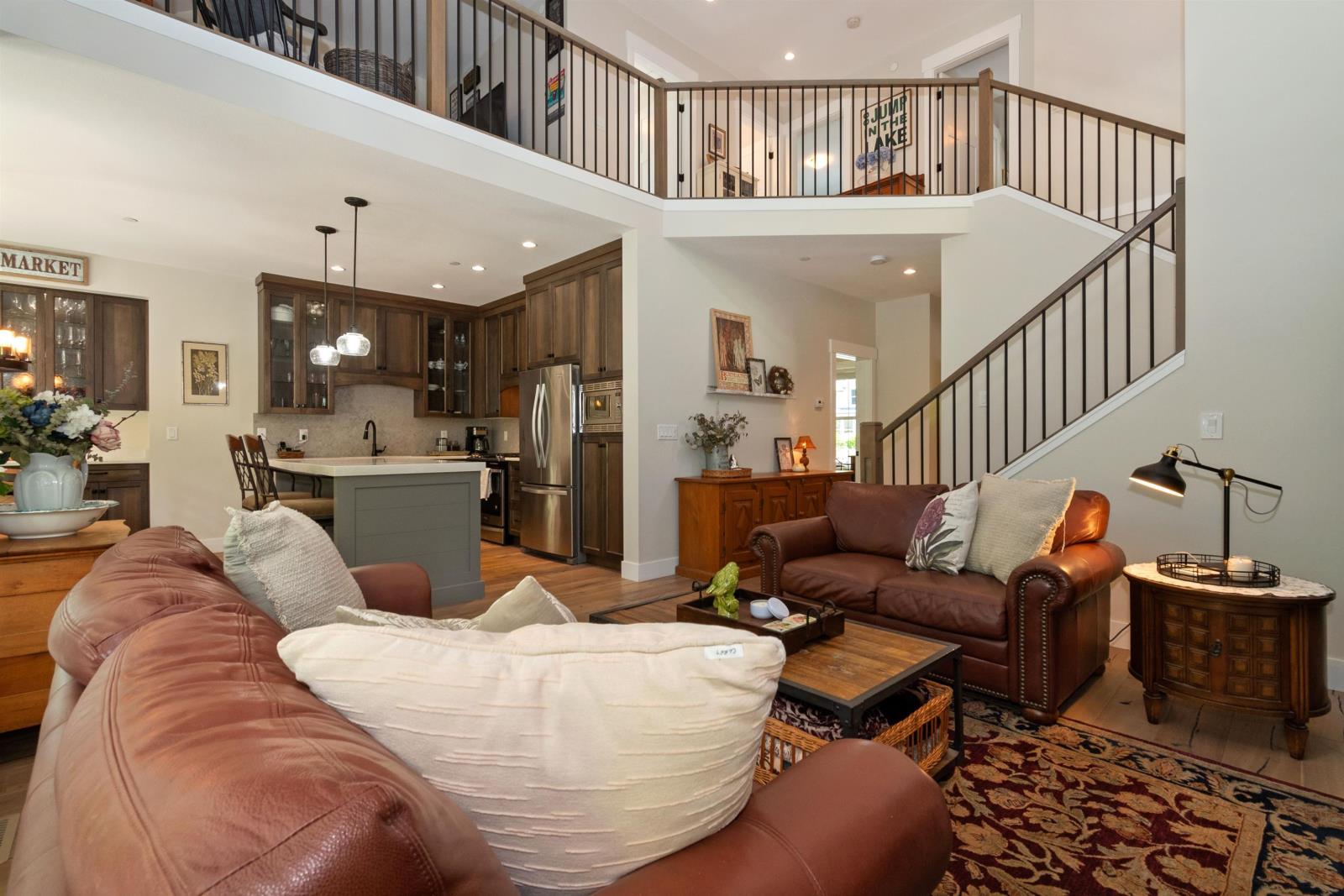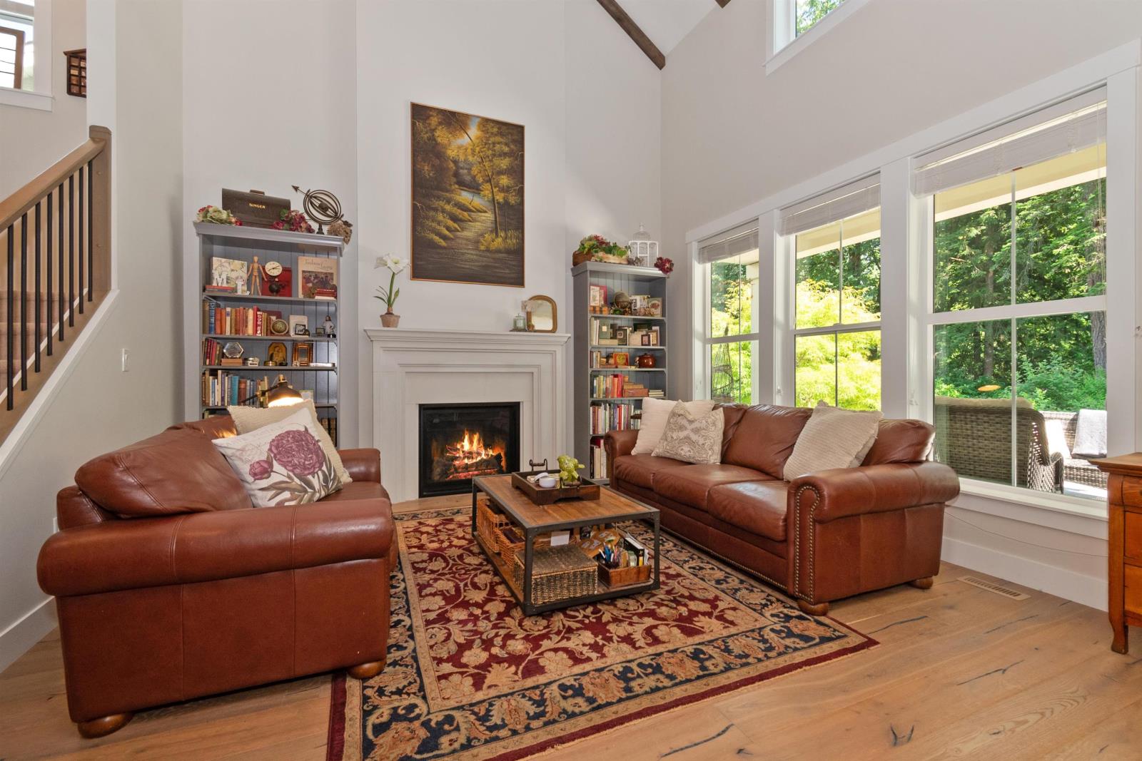 Harvest new friendships and a rich outdoor lifestyle by the lake in this pretty and peaceful home at Creekside Mills. Nestled against a scenic forest backdrop, enjoy unobstructed views of mother nature, and her soothing sounds of songbirds and trickling water. Its 1,705 sq.ft offers a romantic take on farmhouse living. Subtle vintage touches incl. distressed white oak floors, rich toned cabinetry, custom fit hutch, a timeless limestone fireplace and lots of built-in storage. Additional upgrades incl. a water softener, A/C, a 27 ft. extended garage with a 3-car driveway and gutter guards. The main level owner's wing fits a king, has his/her closets and a heated floor en-suite with double sinks. 2 more bedrooms for family/guests/office/hobbies share upstairs with an open loft. Here's your chance to join this active-living community! 10 acres of community gardens, orchards, a clubhouse that hosts year-round events, 2 pools, hot tub, gym, sports court, walking trails, dog park, playgrounds and friendly neighbours! (id:48970)