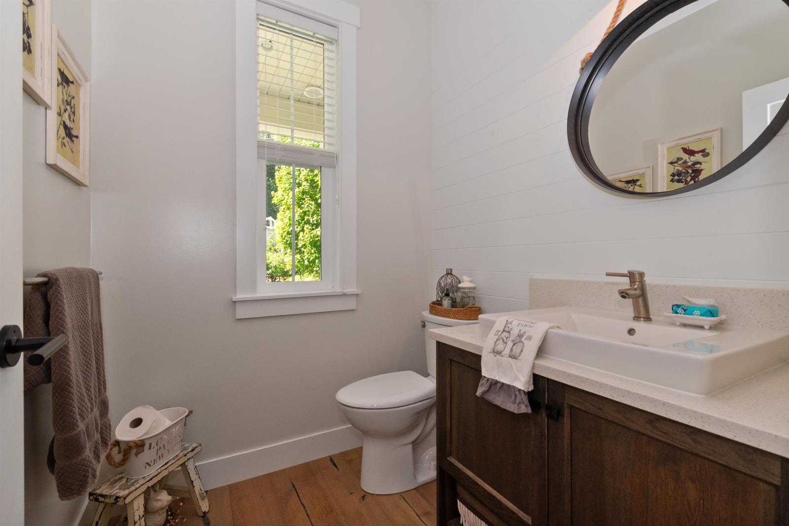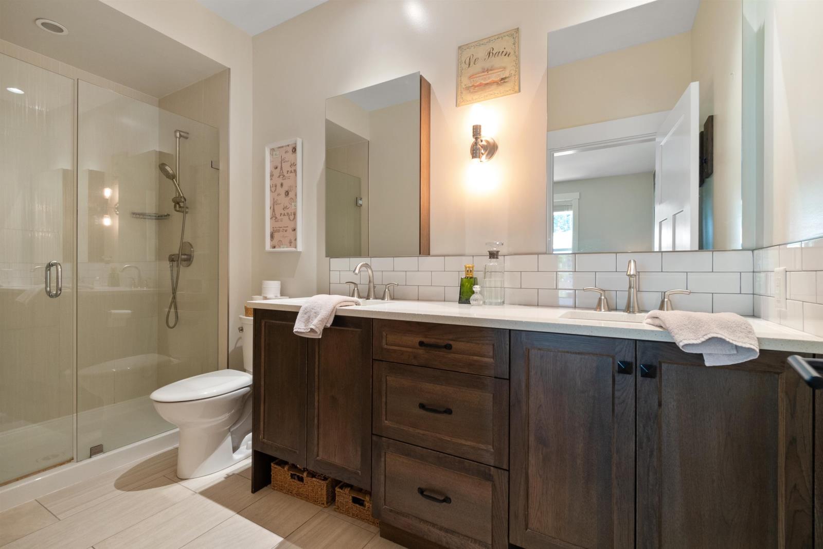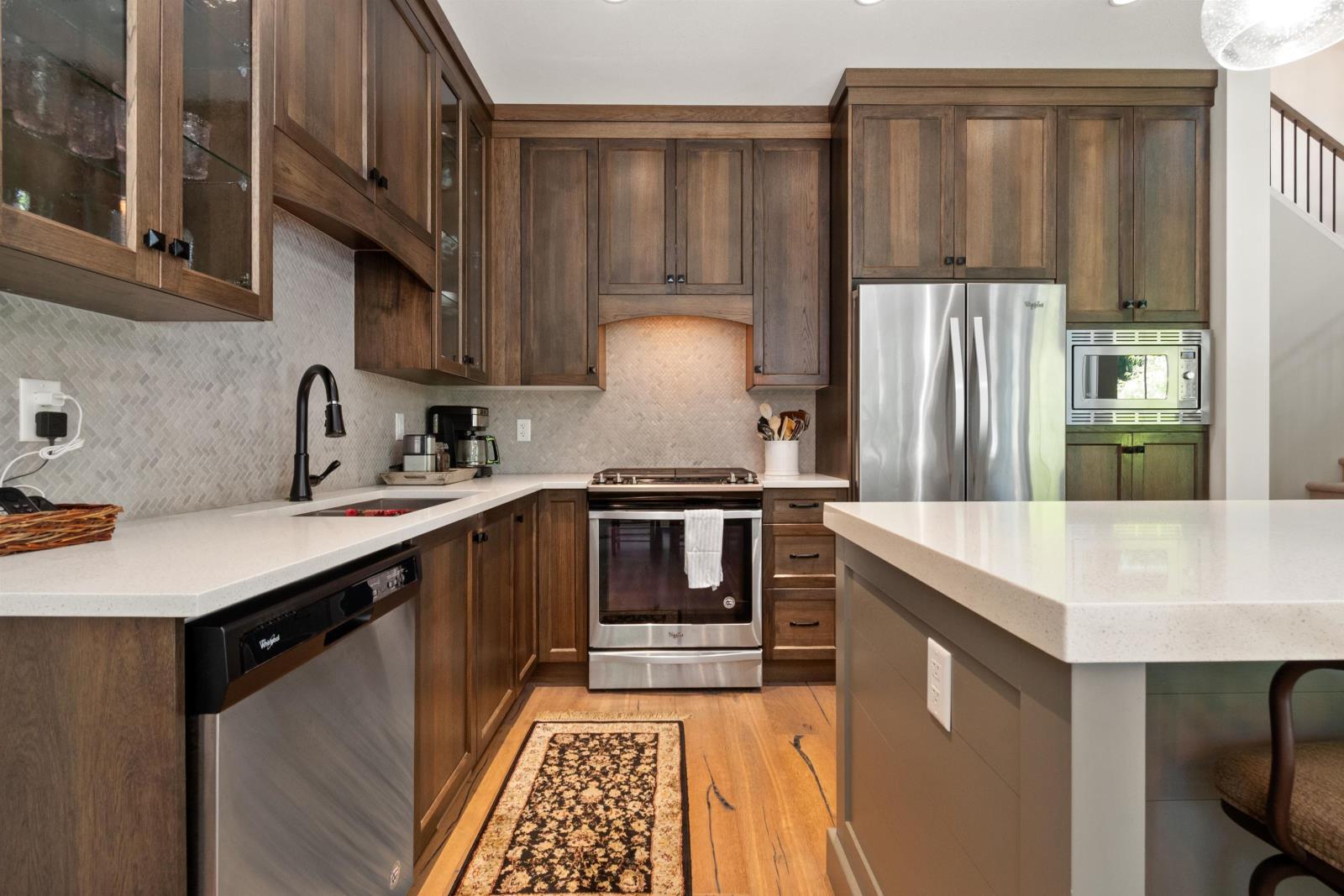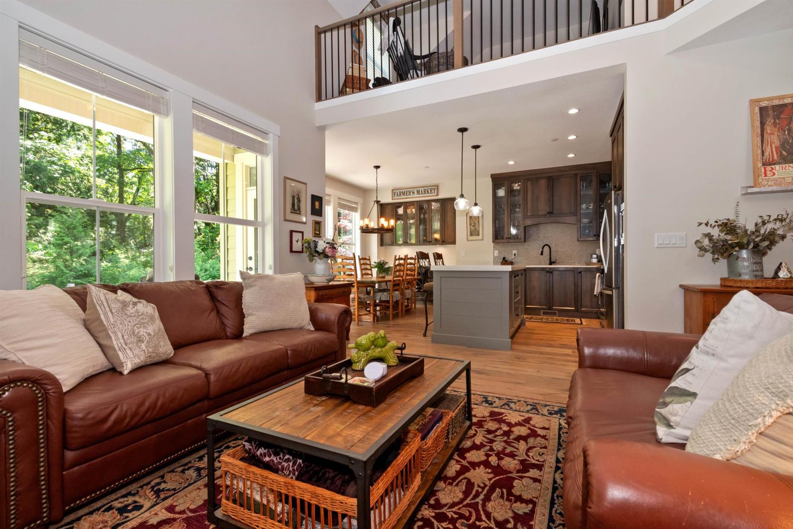 Harvest new friendships and a rich outdoor lifestyle by the lake in this pretty and peaceful home at Creekside Mills. Nestled against a scenic forest backdrop, enjoy unobstructed views of mother nature, and her soothing sounds of songbirds and trickling water. Its 1,705 sq.ft offers a romantic take on farmhouse living. Subtle vintage touches incl. distressed white oak floors, rich toned cabinetry, custom fit hutch, a timeless limestone fireplace and lots of built-in storage. Additional upgrades incl. a water softener, A/C, a 27 ft. extended garage with a 3-car driveway and gutter guards. The main level owner's wing fits a king, has his/her closets and a heated floor en-suite with double sinks. 2 more bedrooms for family/guests/office/hobbies share upstairs with an open loft. Here's your chance to join this active-living community! 10 acres of community gardens, orchards, a clubhouse that hosts year-round events, 2 pools, hot tub, gym, sports court, walking trails, dog park, playgrounds and friendly neighbours! (id:48970)