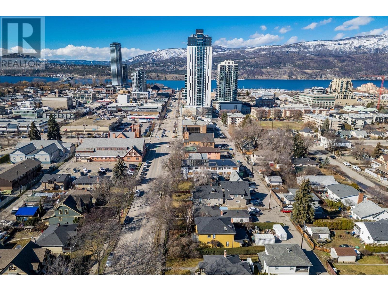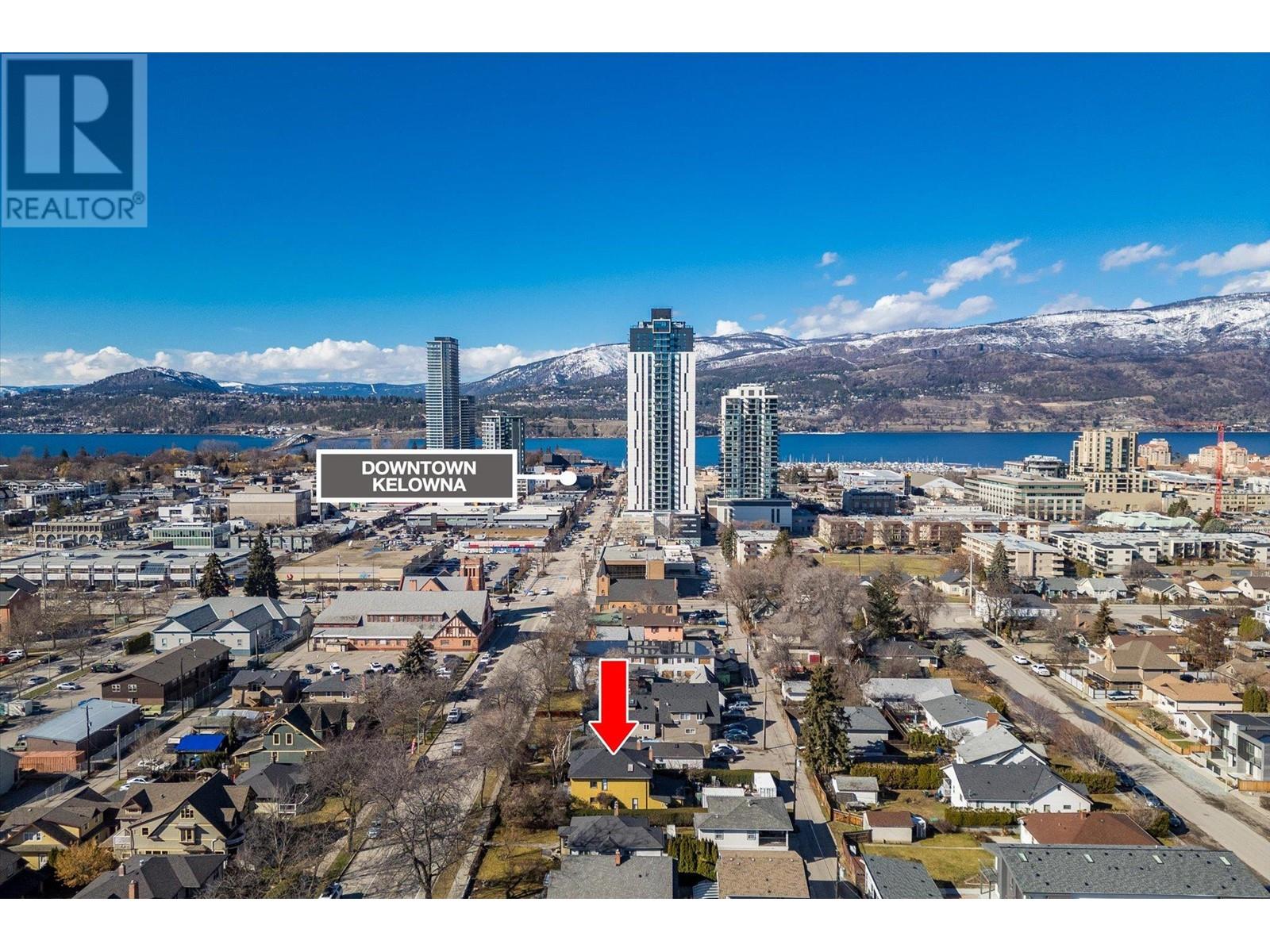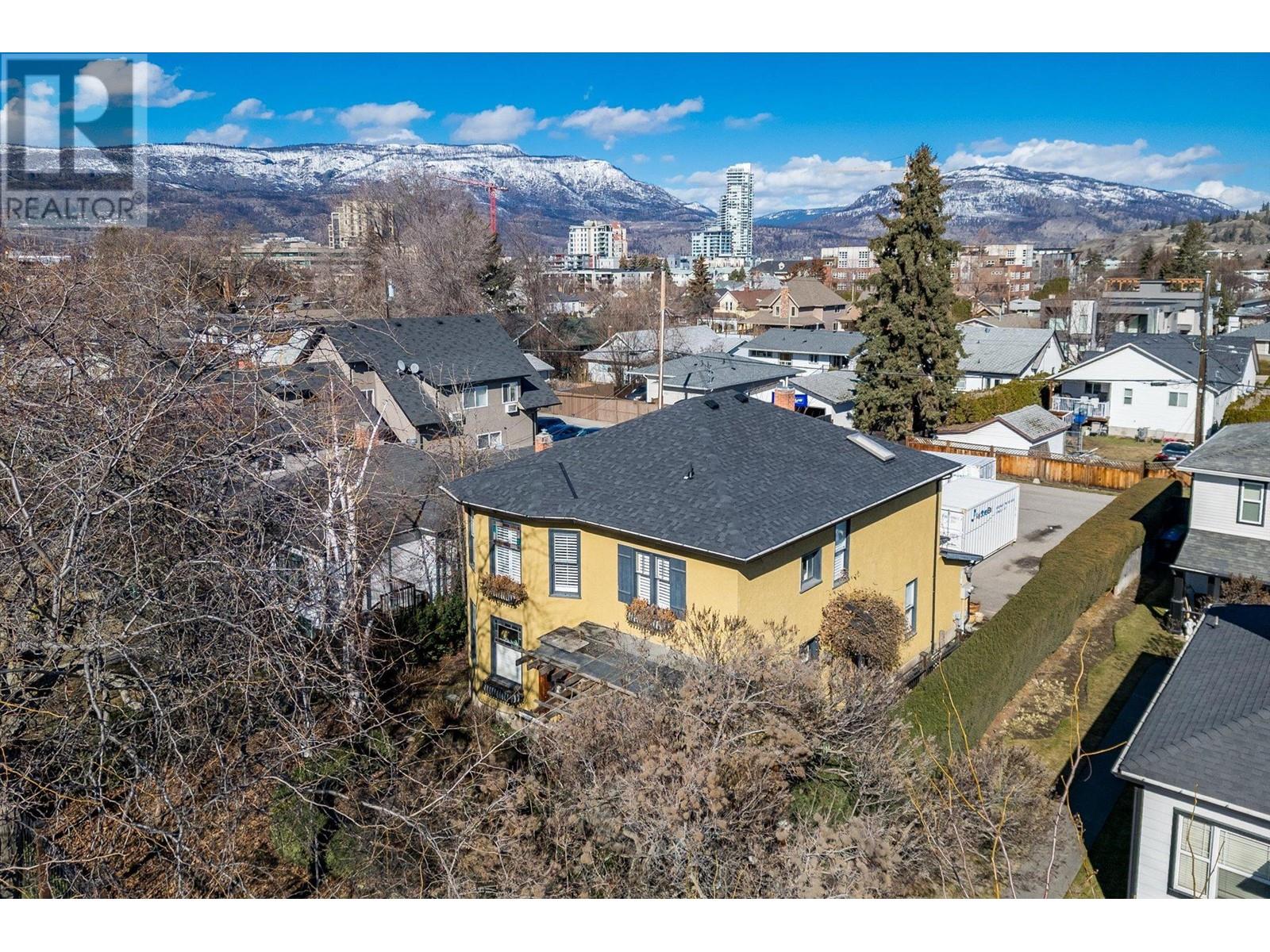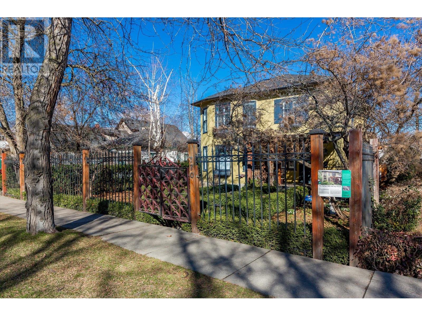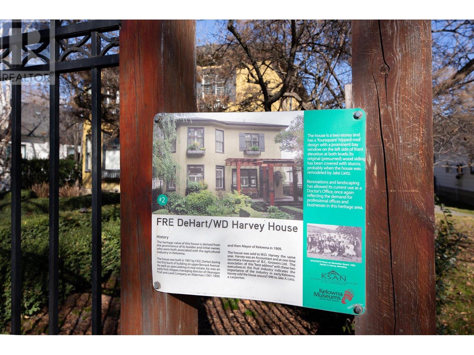 This extraordinary heritage property is perfectly situated on Kelowna’s historical Bernard Avenue one block east of the Downtown Urban Core, a stone’s throw from the sandy shores of Lake Okanagan, world-class wineries and breweries, an international art gallery and a plethora of quaint boutiques and delectable cafes. Significantly renovated in 2009 to house a thriving medical practice, this  commercial and residential property with a Heritage Revitalization Agreement in place, supports over 1400 square feet of commercial use on the main floor, in addition to a fantastic self-contained residential suite that includes 2 bedrooms and a den, a open and bright kitchen with white cabinetry, stainless steel appliances, a sky light and tiled floors. Did we mention there is a new roof? The main level commercial space is beautifully reimagined to include rooms that offer the following uses: a reception area, a room for staff, two patient rooms, washroom, storage/file rooms as well as an office. This thoughtful space boasts polished concrete floors, hardwood floors and expansive windows with superb quality California Shutters that welcomes ample light and inspiring vistas. Please note the added bonus of 6-8 parking stalls with lane access. This is a once in a lifetime opportunity to own the perfect property in the perfect location. Downtown business reinforces professional opportunities and provides  a cultural touchstone for the community. (id:48970)