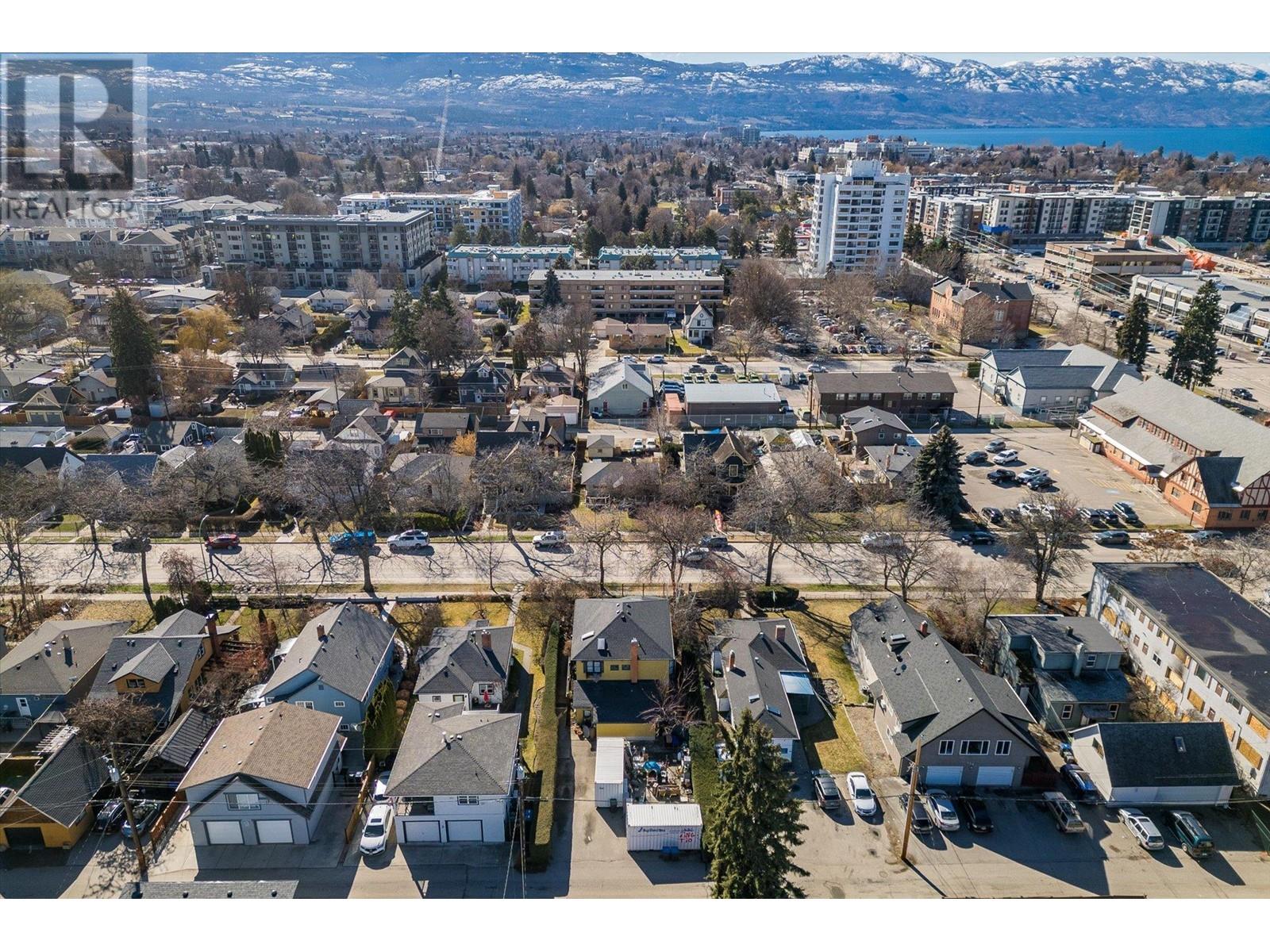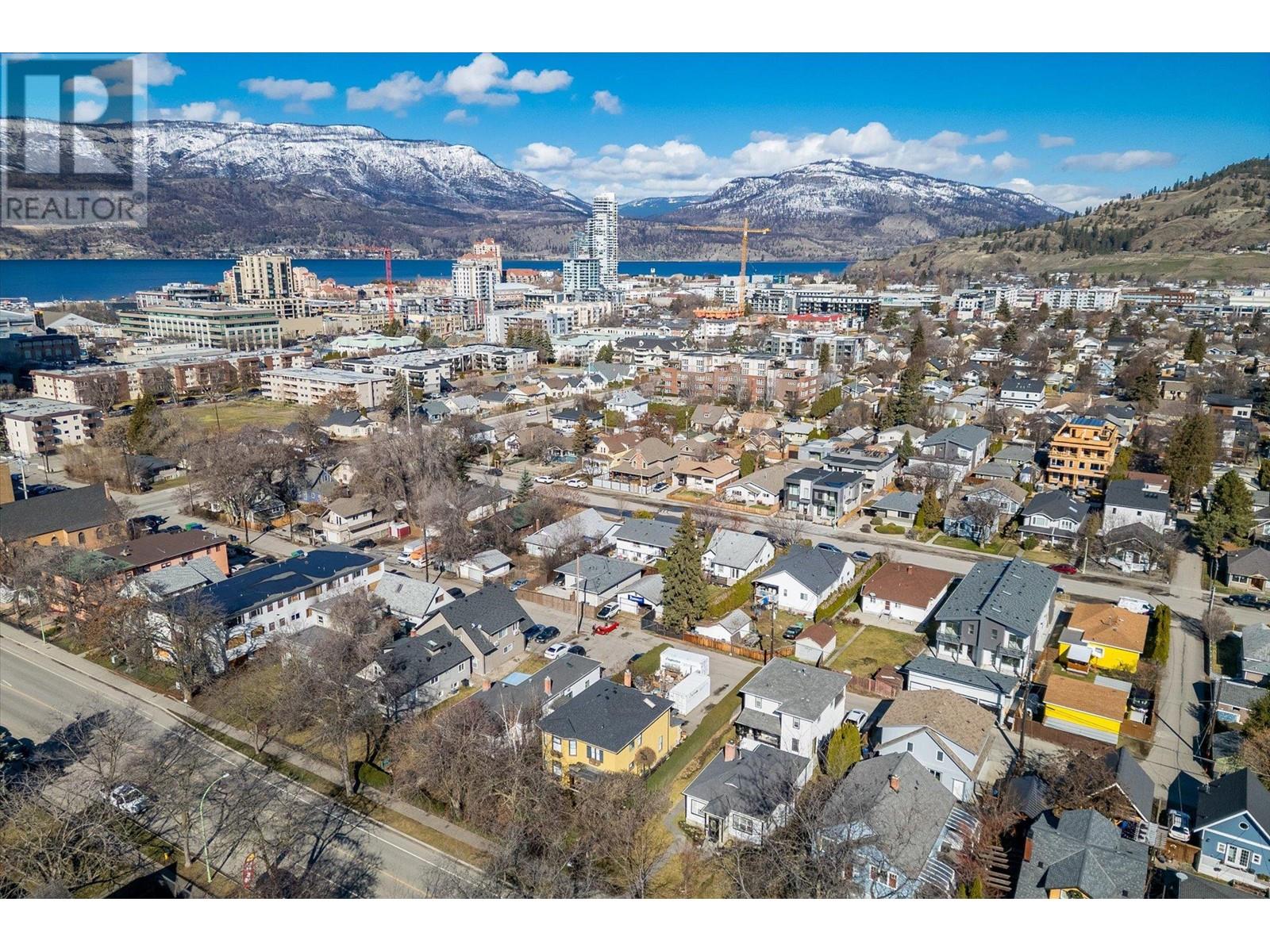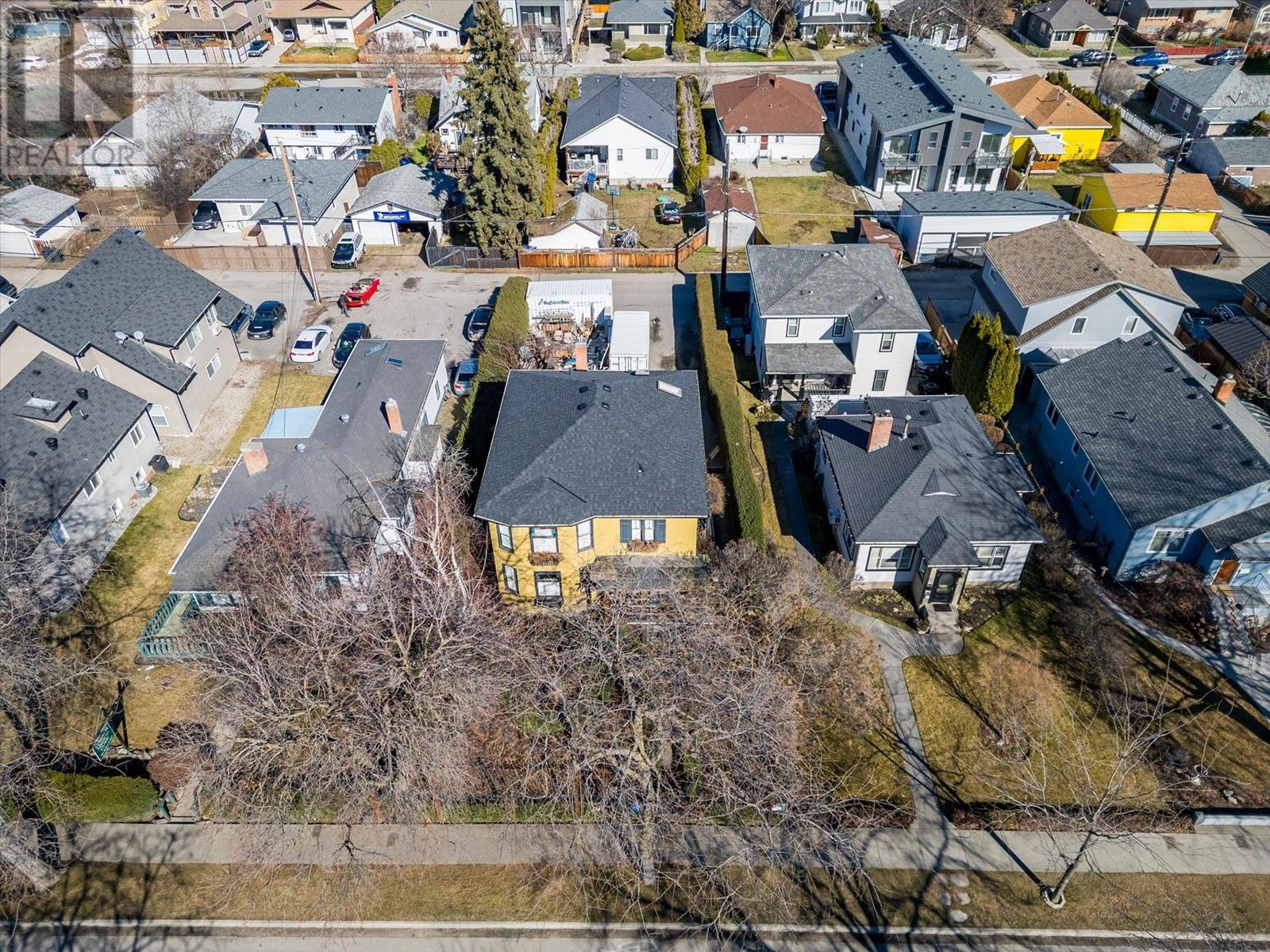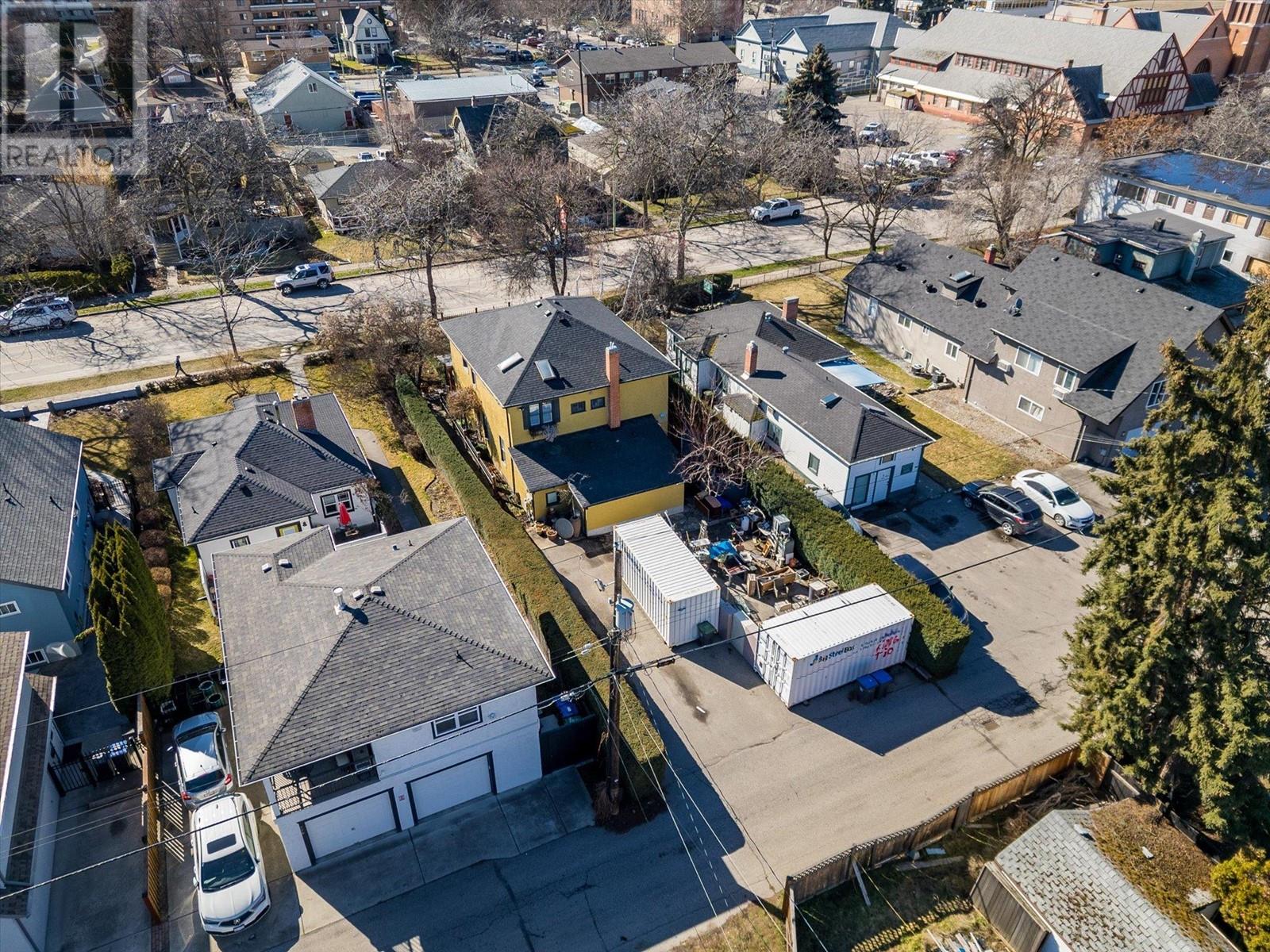 This extraordinary heritage property is perfectly situated on Kelowna’s historical Bernard Avenue one block east of the Downtown Urban Core, a stone’s throw from the sandy shores of Lake Okanagan, world-class wineries and breweries, an international art gallery and a plethora of quaint boutiques and delectable cafes. Significantly renovated in 2009 to house a thriving medical practice, this  commercial and residential property with a Heritage Revitalization Agreement in place, supports over 1400 square feet of commercial use on the main floor, in addition to a fantastic self-contained residential suite that includes 2 bedrooms and a den, a open and bright kitchen with white cabinetry, stainless steel appliances, a sky light and tiled floors. Did we mention there is a new roof? The main level commercial space is beautifully reimagined to include rooms that offer the following uses: a reception area, a room for staff, two patient rooms, washroom, storage/file rooms as well as an office. This thoughtful space boasts polished concrete floors, hardwood floors and expansive windows with superb quality California Shutters that welcomes ample light and inspiring vistas. Please note the added bonus of 6-8 parking stalls with lane access. This is a once in a lifetime opportunity to own the perfect property in the perfect location. Downtown business reinforces professional opportunities and provides  a cultural touchstone for the community. (id:48970)