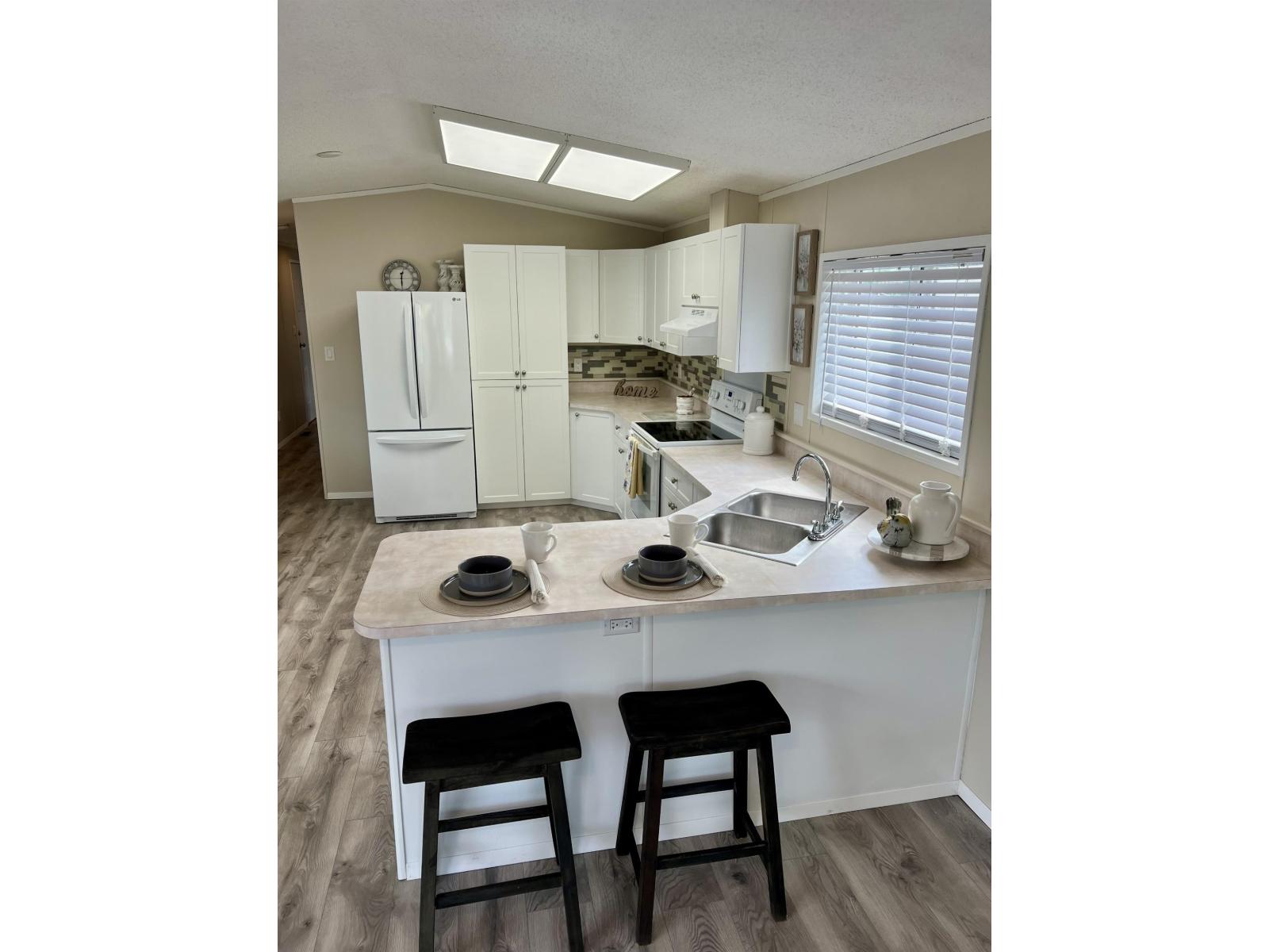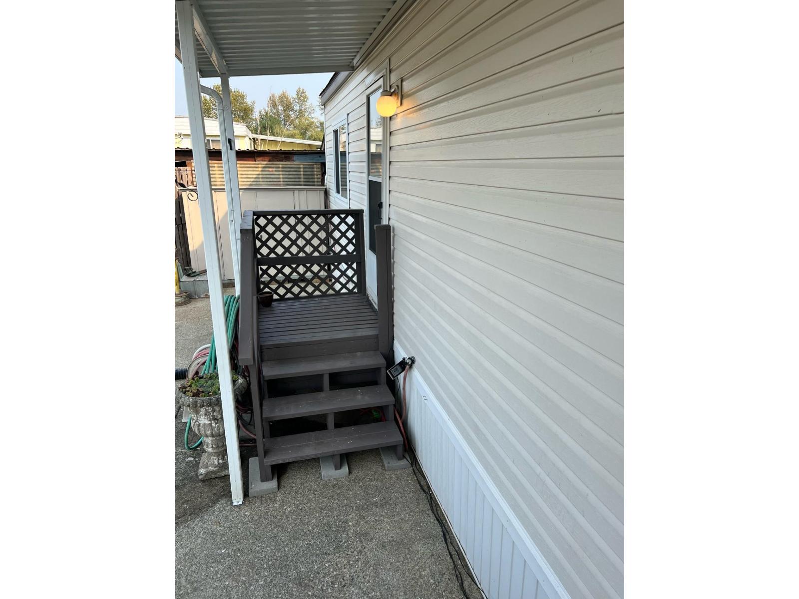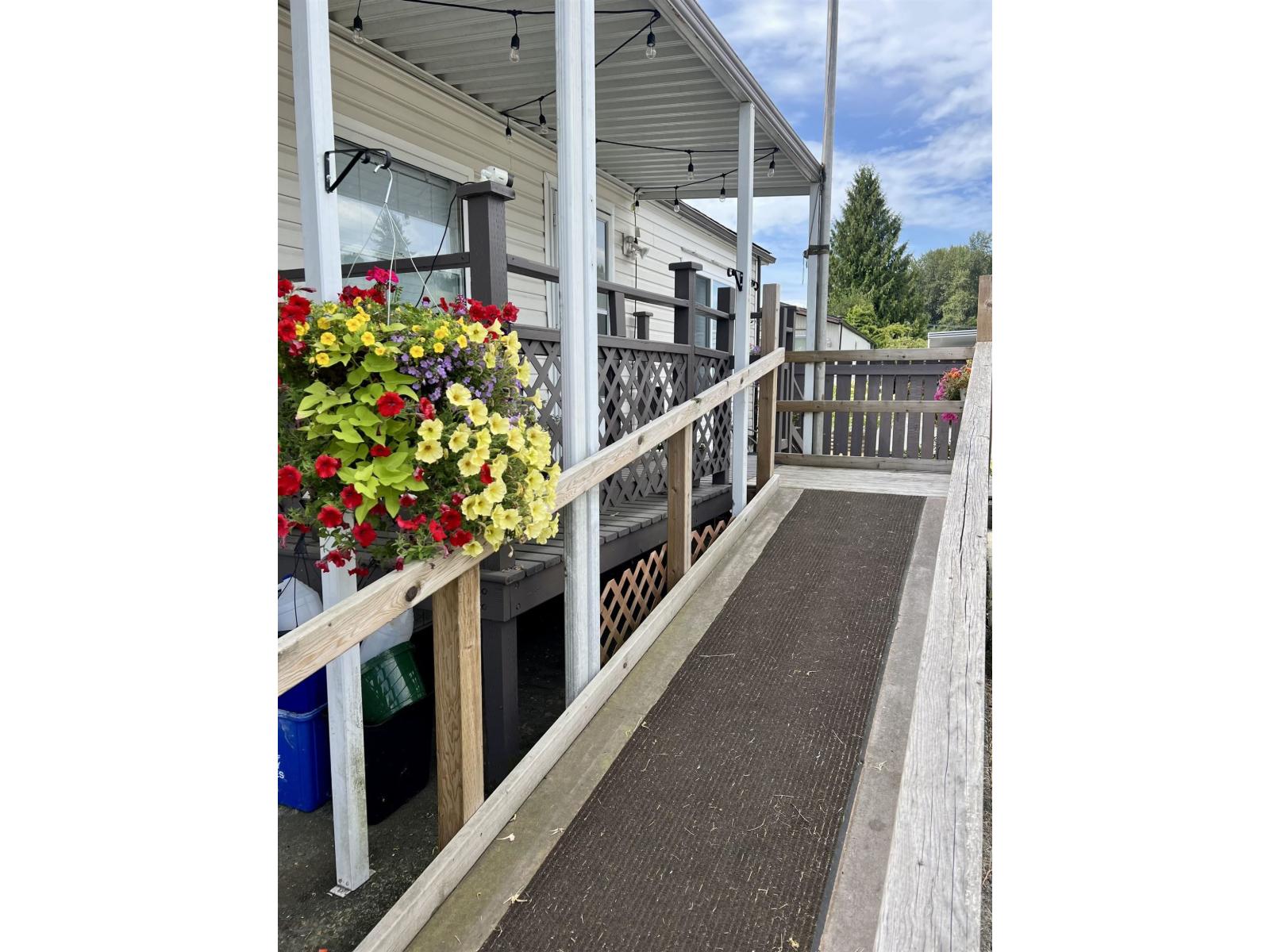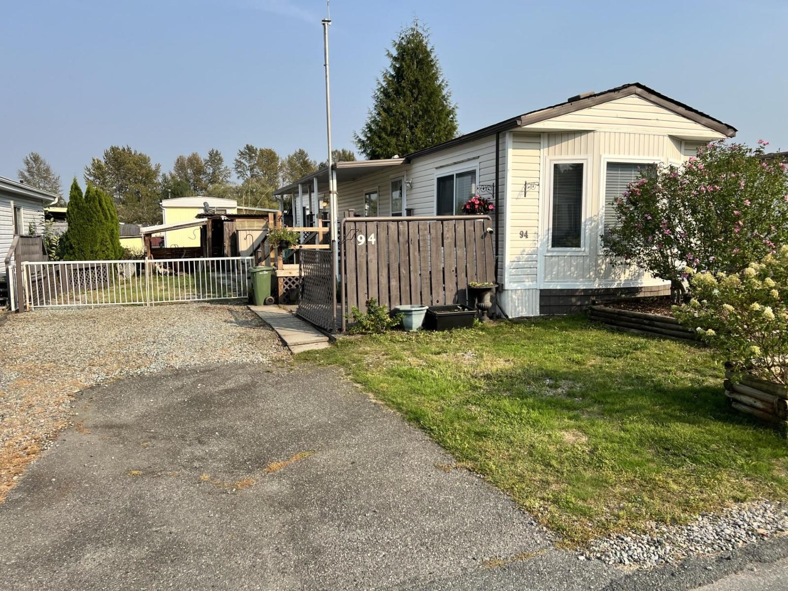 Welcome to Georgian Park, Abbostford's premier 55+ mobile home community. Conveniently located near shopping, transit, walking trails and highway access. Home number 94 is a single wide home on a double wide lot situated in the middle of the community on one of the most sought after middle streets with minimal traffic. This newly renovated 2 bedroom home boasts all new 15mm laminate planking throughout, fresh neutral wall paint, brand new custom kitchen cabinet doors with tile backsplash, brand new decora light switches & plugs. All new LED lighting, fixtures & new window coverings throughout. Updated bathroom with new toilet, newer vanity. Large multi level newly painted decking with wheelchair accessible ramp. Very large 26' x 9' enclosed storage shed/workshop with separate electrical panel & 240volt plug. This home would allow a separate add on living space with management approvals & city permits. 2 small pets allowed, park management approval required to purchase this move in ready home. (id:48970)