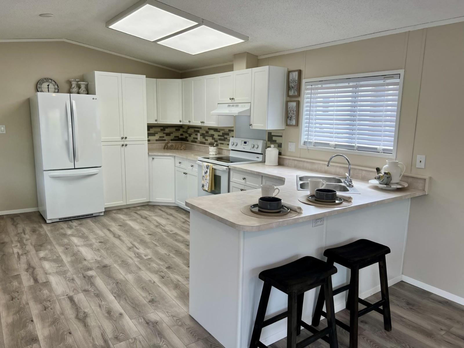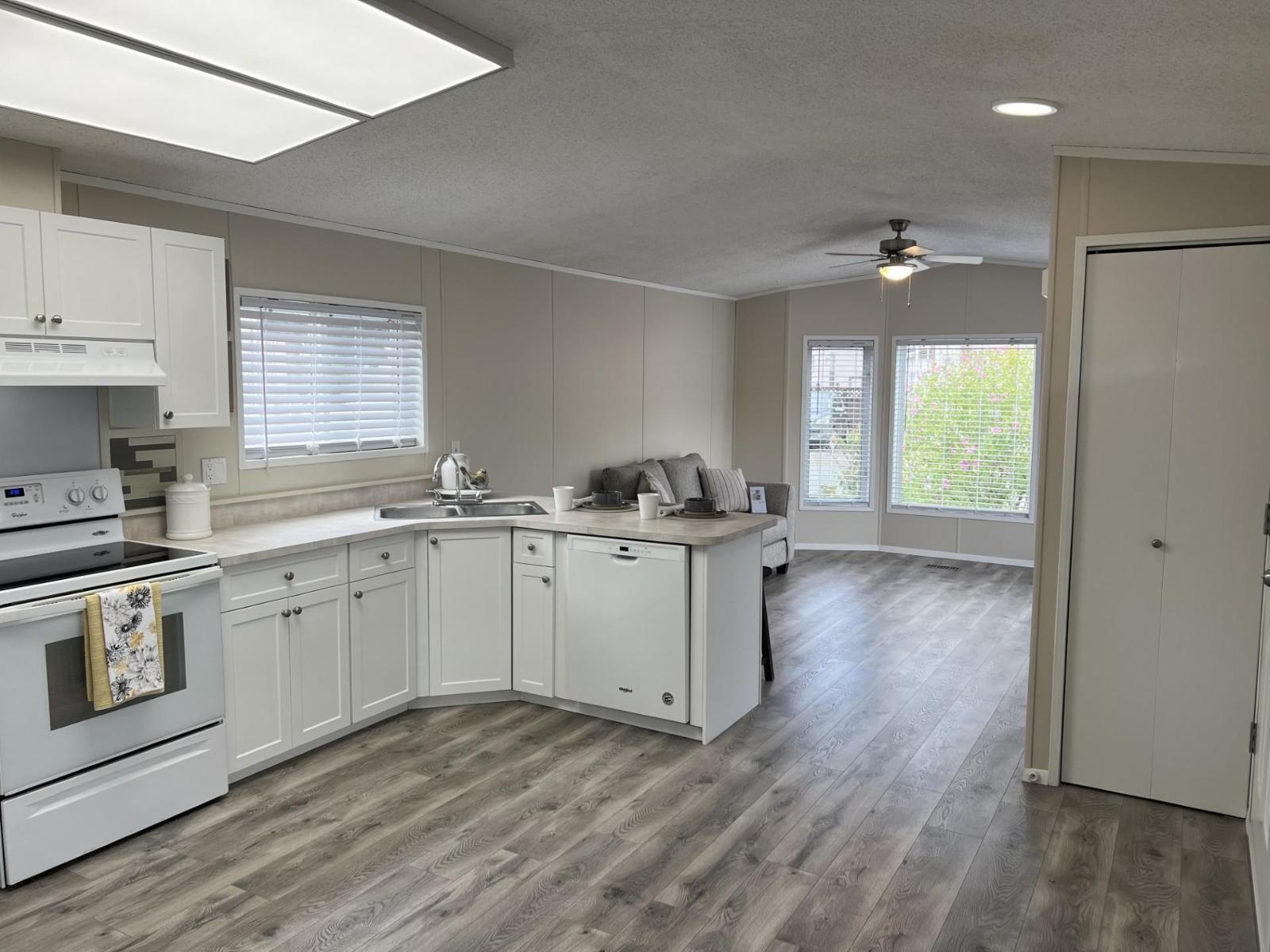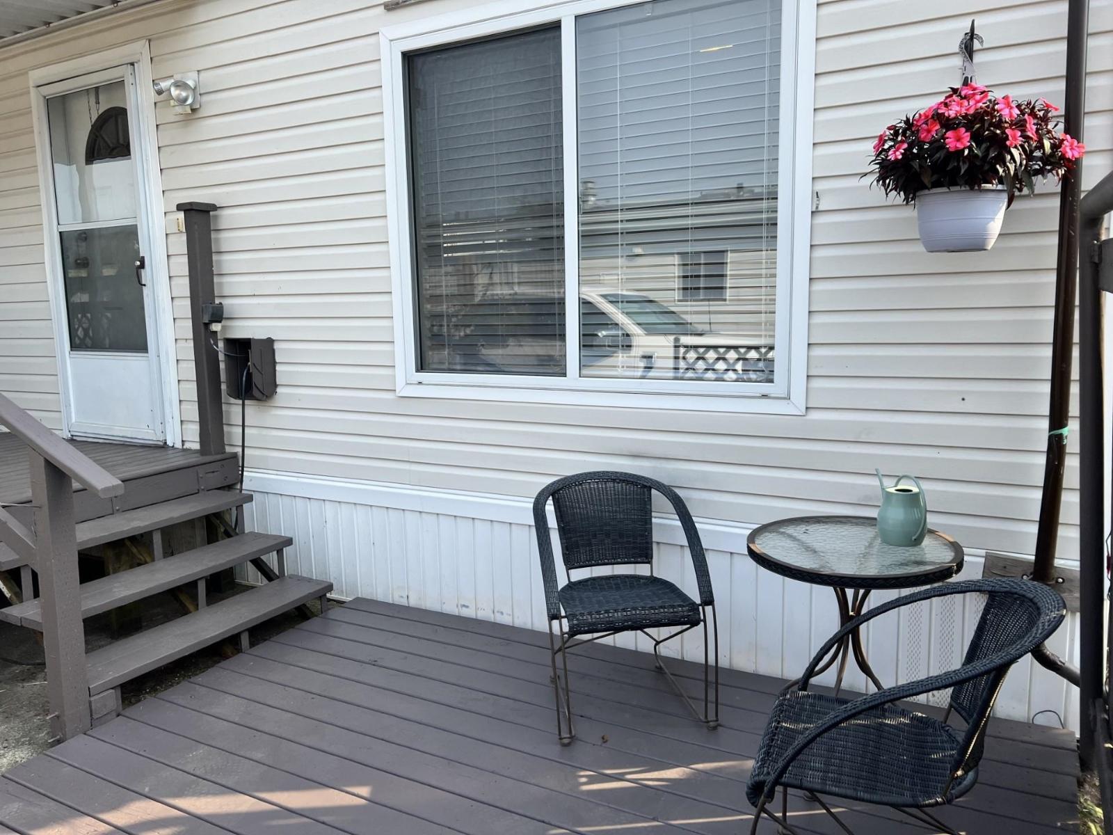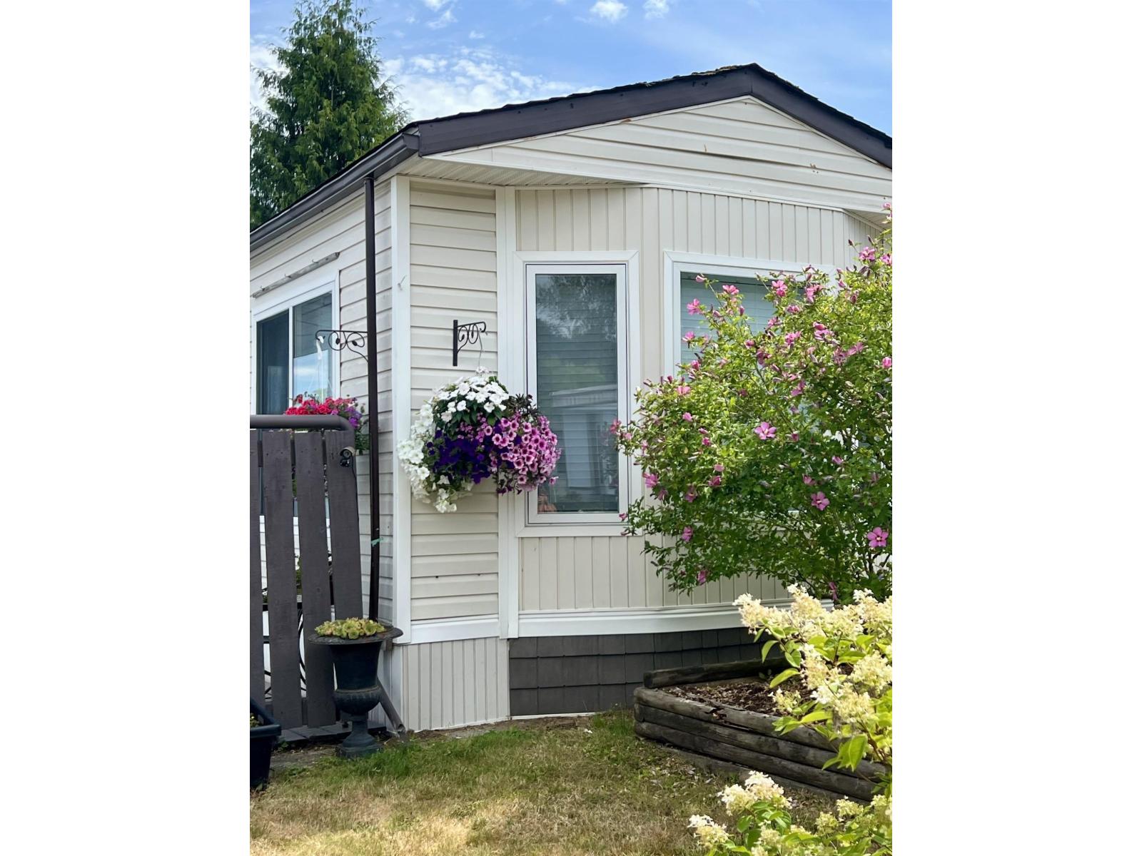 Welcome to Georgian Park, Abbostford's premier 55+ mobile home community. Conveniently located near shopping, transit, walking trails and highway access. Home number 94 is a single wide home on a double wide lot situated in the middle of the community on one of the most sought after middle streets with minimal traffic. This newly renovated 2 bedroom home boasts all new 15mm laminate planking throughout, fresh neutral wall paint, brand new custom kitchen cabinet doors with tile backsplash, brand new decora light switches & plugs. All new LED lighting, fixtures & new window coverings throughout. Updated bathroom with new toilet, newer vanity. Large multi level newly painted decking with wheelchair accessible ramp. Very large 26' x 9' enclosed storage shed/workshop with separate electrical panel & 240volt plug. This home would allow a separate add on living space with management approvals & city permits. 2 small pets allowed, park management approval required to purchase this move in ready home. (id:48970)